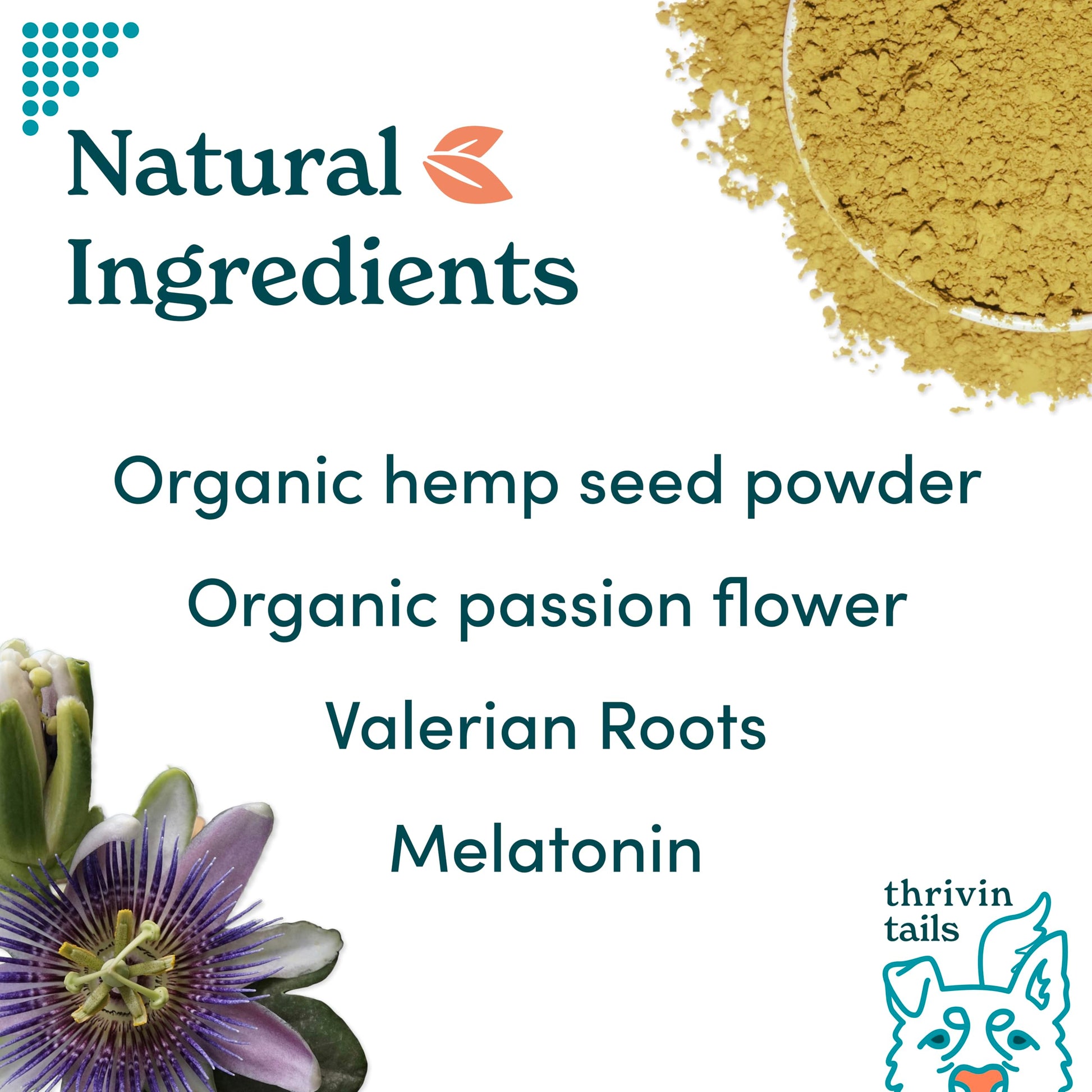**Calming Chews for Dogs**: Thrivin Tails Bacon-Flavored Calming Chews are expertly formulated to provide gentle calming support for dogs, incorporating CBD and Melatonin to soothe anxious behaviors effectively. Whether its during thunderstorms or separation anxiety, these chews help bring tranquility to your dogs life.