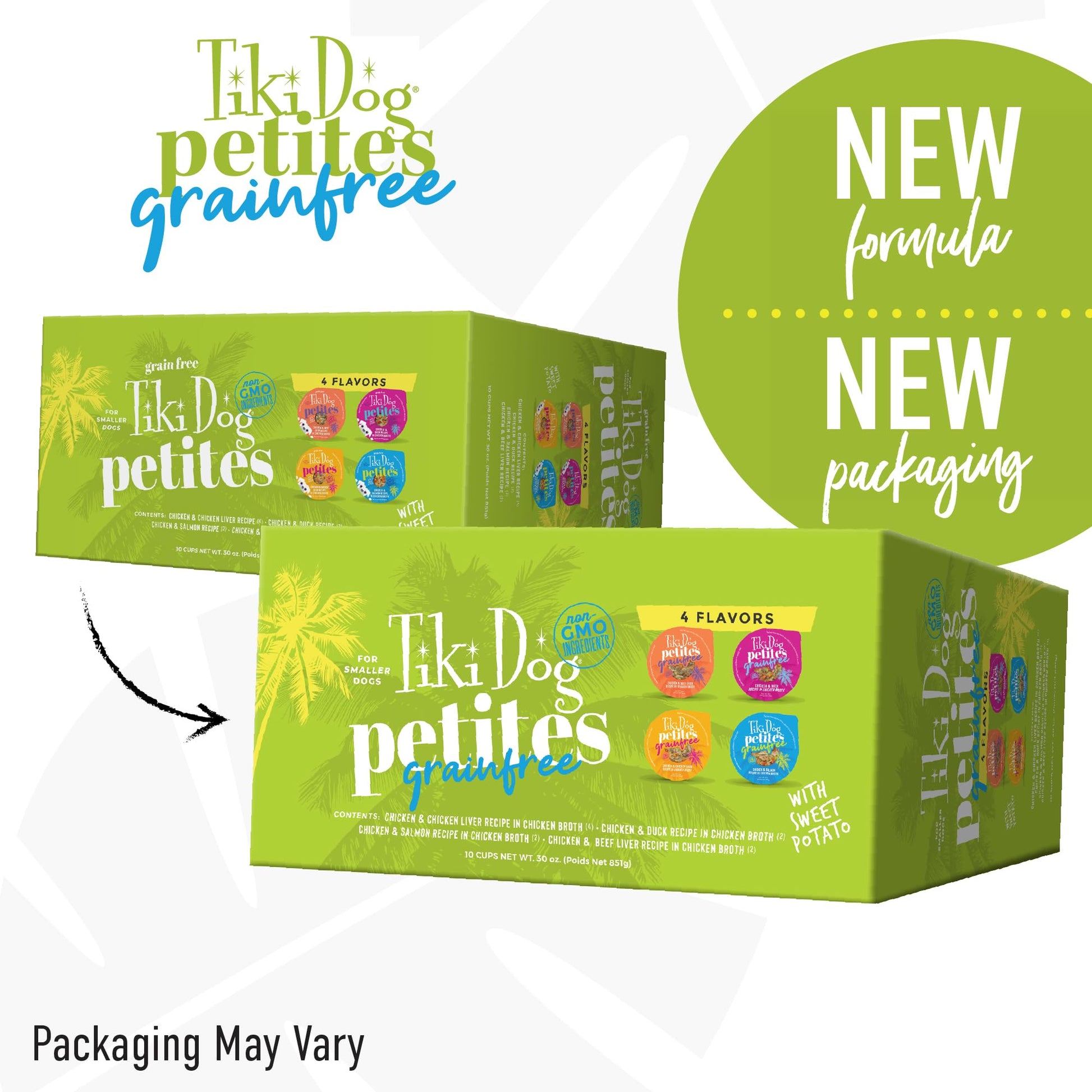 Details: Tiki Dog Petites Grain Free Wet Dog Food, Variety Pack, 3 oz. Cups (10 Count). Tiki Dog Petites Grain Free offers a variety pack of grain-free meals that include whole, shredded chicken, flaked salmon and nutritious vegetables that are steamed fresh and hand-packed in a delicate broth.