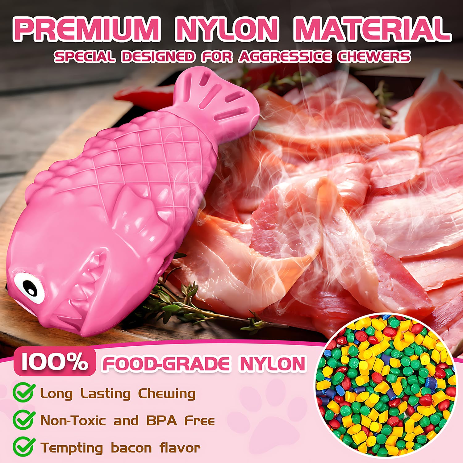 • IRRESISTIBLE BACON FLAVOR & SQUEAKY DOG TOYS: Our dog toys feature a unique bacon flavor and a playful fish shape that entices dogs to chew and play with excitement. When the toy is shaken, the built-in sound generator squeaks, adding even more fun and excitement for your furry friend while preventing them from chewing on furniture or slippers. This interactive feature makes it a great dog toy to keep them busy, reduce boredom and develop good chewing habits