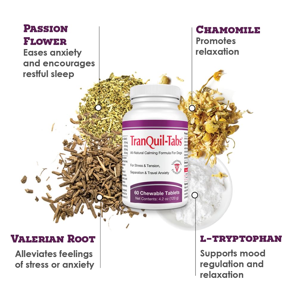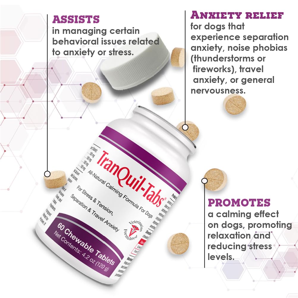 TranQuil-Tabs for Dogs are an all-natural alternative to help dogs maintain a standard and relaxed disposition while coping with external stresses.