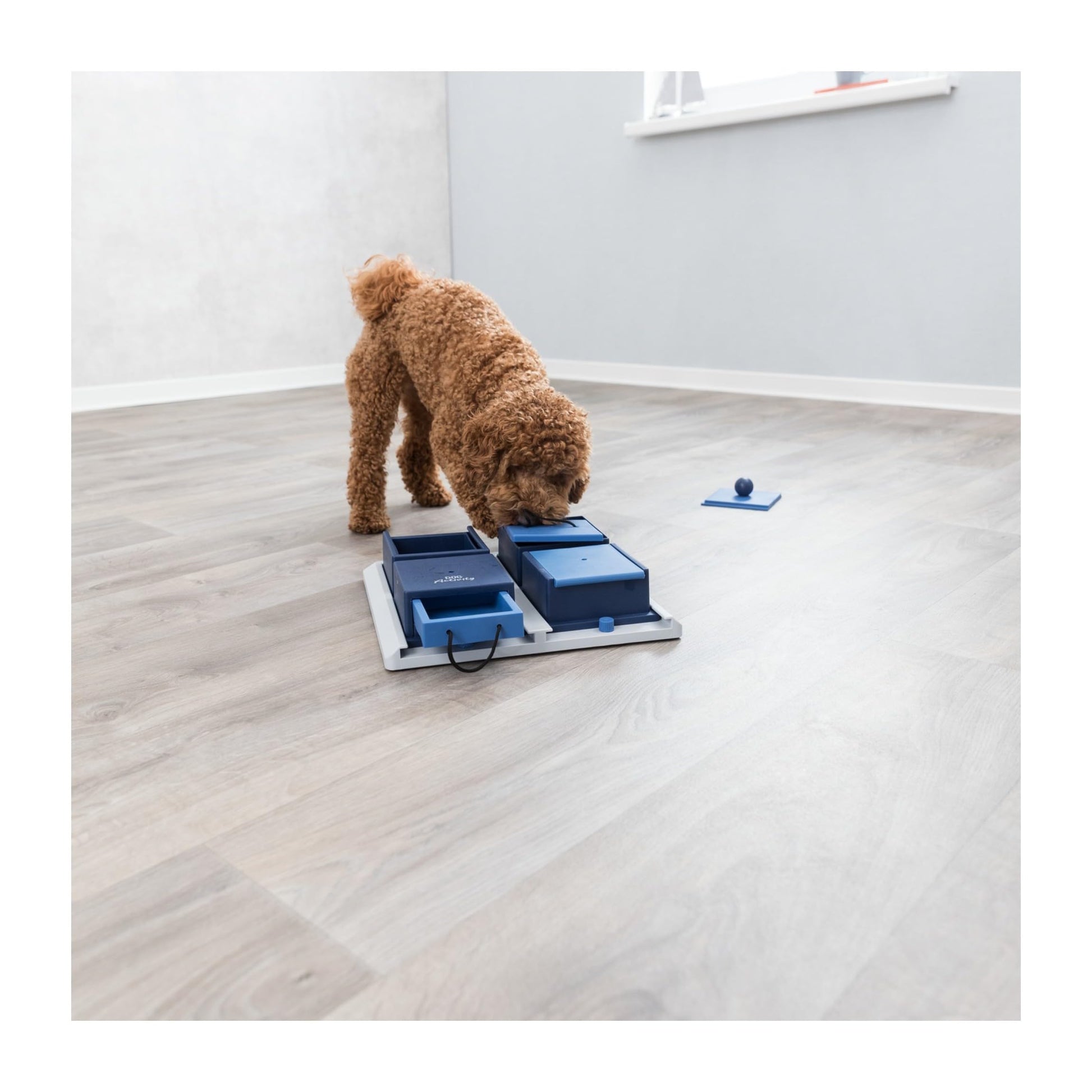 Details: Dogs are very playful and intelligent animals. Channel their energy and curiosity into something positive with TRIXIE's Poker Box. It's designed for the intermediate canine gamer. Each compartment has a different challenge to master, in order to retrieve a treat-lids, flaps, knobs, ropes and drawers. Vary the number and placement of treats to increase the level of difficulty. The non-slip rubber feet keep the game in place as your dog explores. We've also included an instructional booklet with tips and tricks for challenging and training dogs of all ages through play. Dishwasher safe. Measures 12 x 12 x 4 inches. Weight 1 lb.