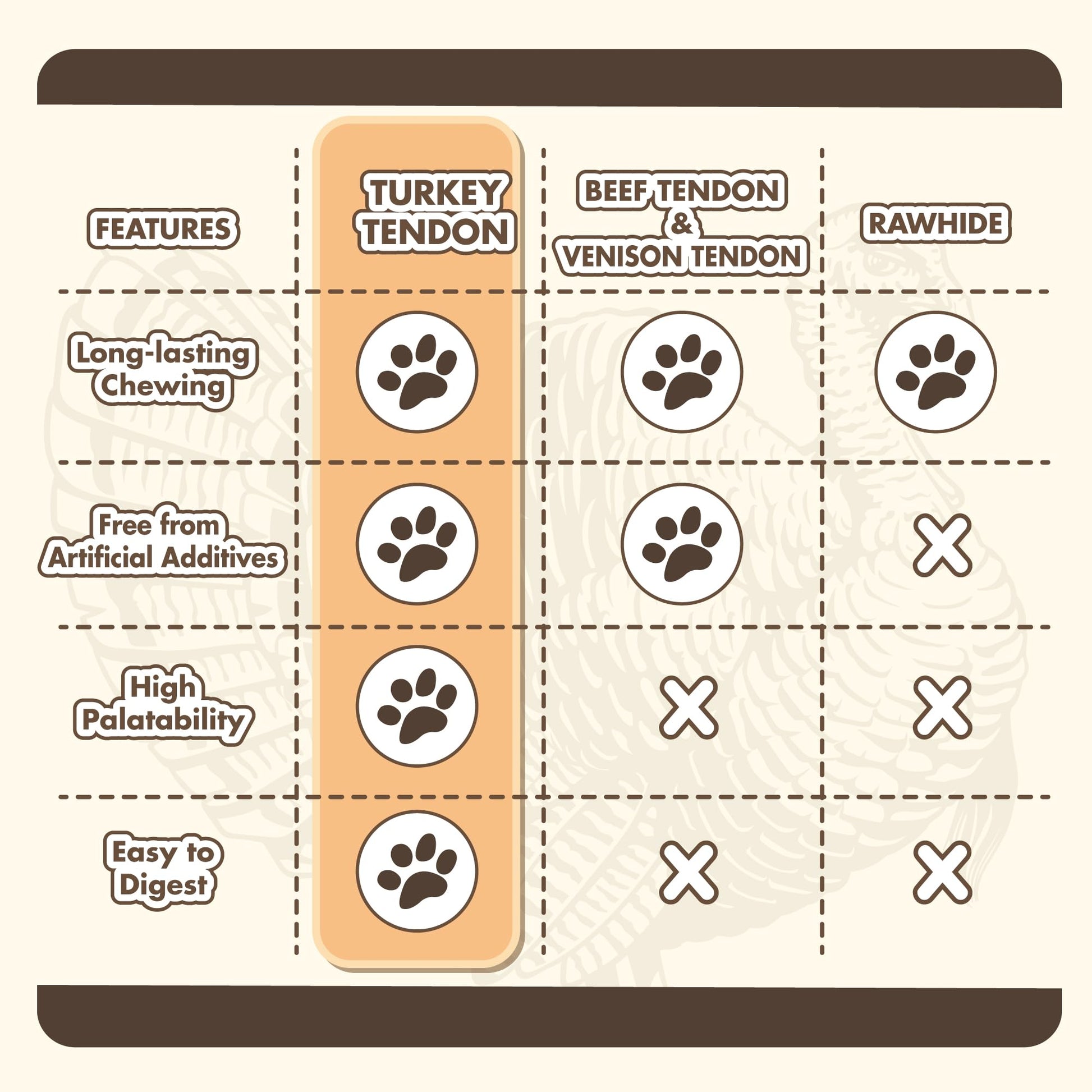 - 100% Natural & Premium-Quality Turkey Tendons: Made from a single ingredient—pure, USA-sourced turkey tendon—with absolutely no additives, no preservatives, no artificial flavors, no antibiotics, and no growth hormones. A healthier and safer alternative to rawhide, perfect for pet parents who prioritize natural nutrition for their dogs.