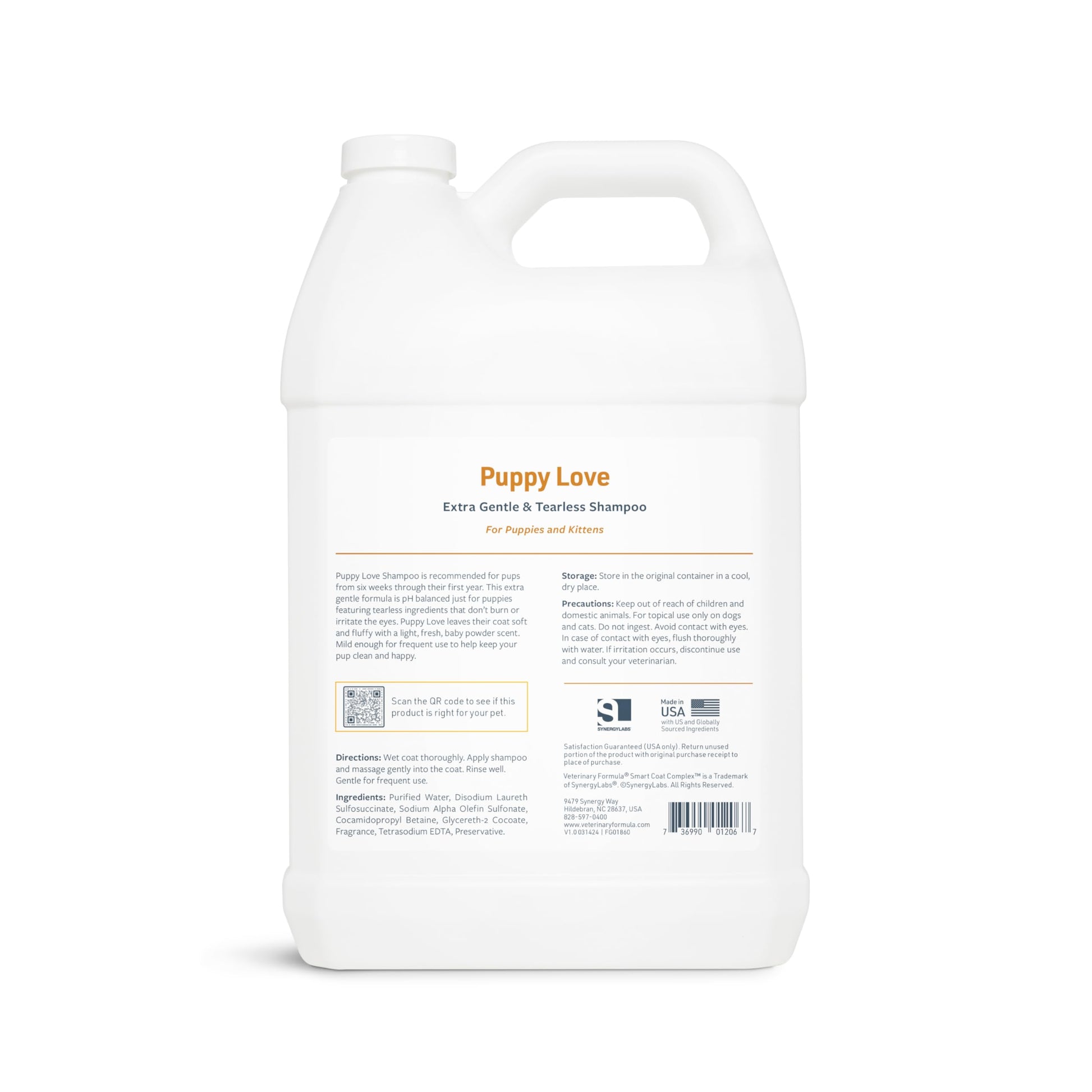 Details: Like bringing home a new baby, when you bring home a new puppy you only want to use the gentlest cleansing products for their extra delicate skin. Veterinary Formula Solutions Puppy Love Shampoo is recommended by veterinarians for a puppy’s first year. Sulfate and DEA-free, this puppy dog shampoo cleanses without drying out puppy’s delicate skin and leaves their coat soft and fluffy. Mild enough for puppies over 6 weeks, the tearless shampoo will not burn or irritate the eyes. The clean, fresh scent of the puppy shampoo is reminiscent of baby powder. It’s pet shampoo that’s light and not overpowering but remains after bath time is over. Perfect for delicious snuggles! The 128 oz. bottle of Puppy Love extra gentle shampoo is specifically formulated, and pH balanced for puppies. It is gentle enough for frequent use and will not wash away topical spot-on flea and tick treatments. We know that your puppies are more than just pets - they are immediately part of the family - so Veterinary Formula Solutions designs premium cleansing products that pet parents can actually afford. Your puppy will have a clean, soft and fluffy coat and you will like knowing that the extra gentle shampoo is designed specifically for a dog’s first year – making you both happy and able to focus on more important “firsts” like walks, fetch and snuggles.