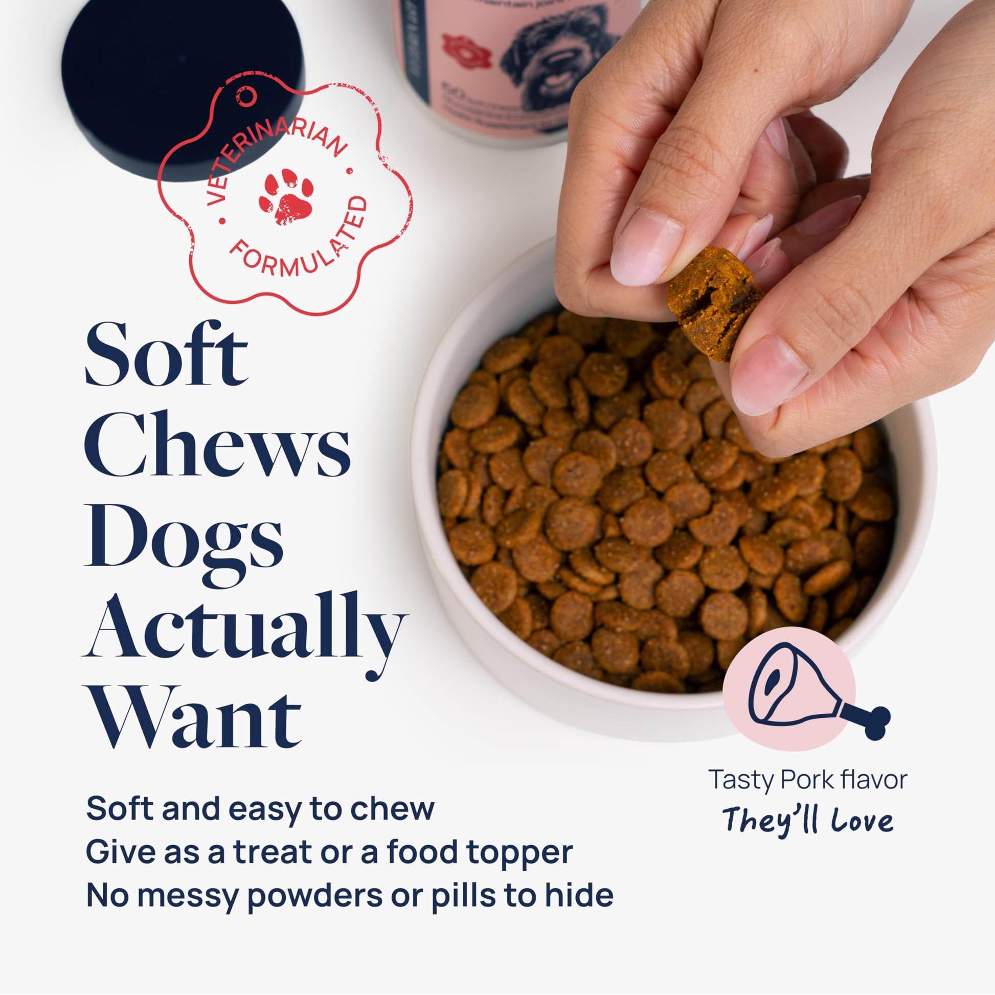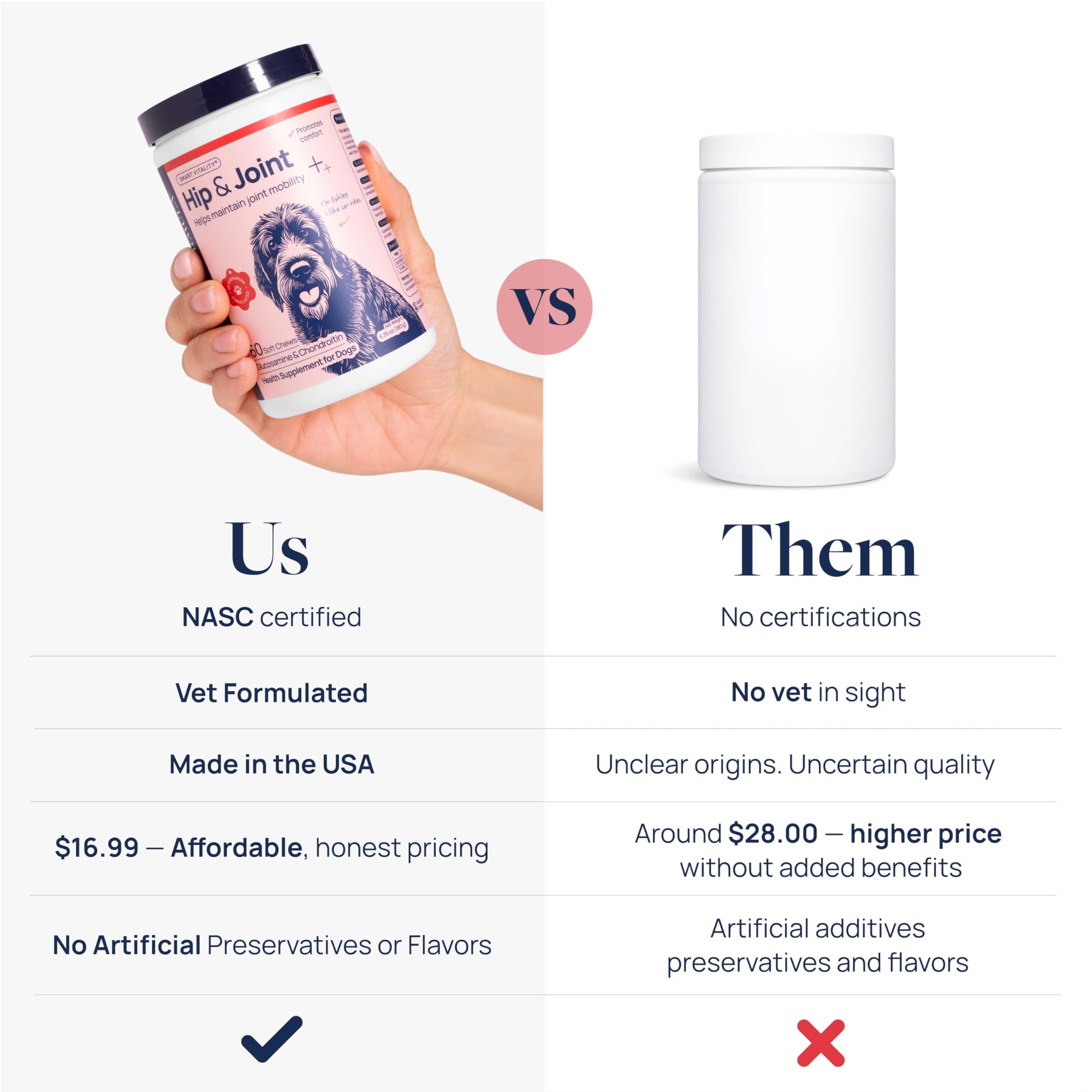 Details: Give your dog the daily support they need to stay active, playful, and comfortable with Veterinary Formula Smart Vitality Hip & Joint Supplement for Dogs. Whether you have a puppy just starting to explore the world, an active dog, a large breed, or a senior slowing down a bit, this hip & joint supplement for dogs is designed to help dogs of all ages and sizes move with ease. Our veterinarian-formulated soft chews combine trusted ingredients like glucosamine for dogs, chondroitin, and turmeric. This powerful blend helps maintain cartilage, support joint structure, and promote healthy flexibility so your dog can keep enjoying stairs, walks, playtime, and all of life’s adventures. These tasty pork-flavored dog glucosamine chews are easy to give — no pills, no messy powders, and no artificial flavors or preservatives. At Veterinary Formula, we know how important it is to choose the right dog supplements for your pet’s health. That’s why our dog hip and joint supplement is made in the USA in a cGMP lab and carries the NASC quality seal, so you can feel confident you’re choosing trusted dog health supplies. With over 150,000 positive reviews, we’re proud to be a pet supplement brand pet parents rely on. Smart Vitality is more than just another dog joint supplement. It’s designed to help support healthy mobility for dogs of all breeds — from small to large breed. Whether you’re looking for a daily joint supplement for dogs, a simple way to provide joint support for dogs, or an easy-to-give option for dog hip and joint care, Veterinary Formula Smart Vitality is here to help your pet feel their best. Support your dog’s healthy hips and joints with every chew. Make Smart Vitality part of your dog health routine today.