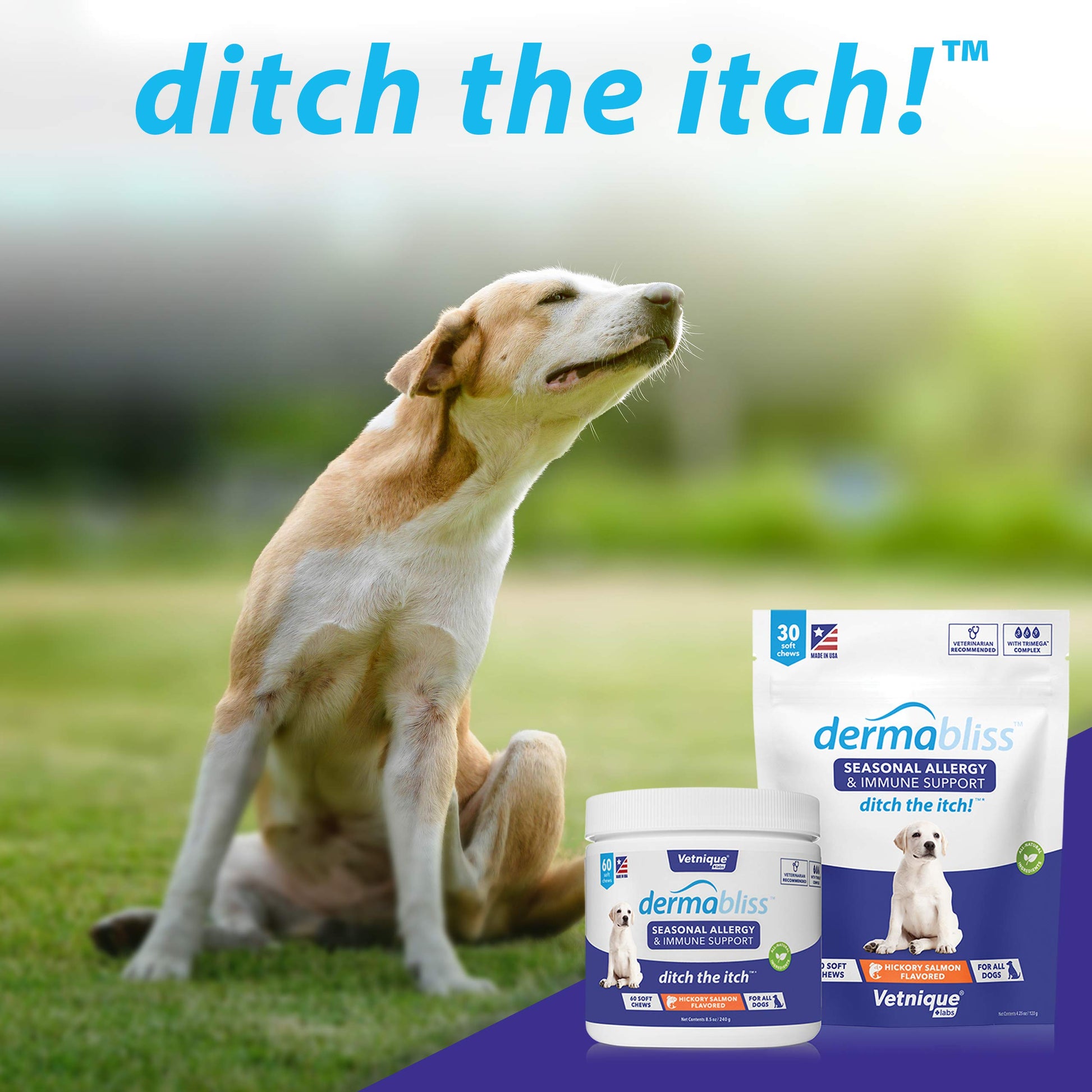 Details: Pets can ditch the itch and boot the scoot with Dermabliss and Glandex! Dermabliss seasonal dog allergy chews are a daily dog multivitamin supplement packed with skin-friendly ingredients to promote pets’ skin health. Finding the best allergy chews for dogs is easy when ingredients are vetted by vets–including our TriMega Omega 3-6-9 complex (to maintain a healthy skin barrier, heart health, and immunity) and Quercetin (to help maintain normal histamine levels). Dermabliss allergy supplements are a tasty way to support cat and dogs’ skin from the inside out! Glandex Anal Gland Support Chews are more than just a dog treat–these vet-recommended chews promote anal gland health in dogs and cats with a patented blend of Fiber, Probiotics, and Omega Fatty Acids. Glandex is a vet-formulated probiotic for dogs that promotes digestive health and regularity, which can be especially helpful while pets are on medication or taking pills. All Vetnique products are vet-formulated, made in the USA with premium ingredients, and contain no artificial flavors or preservatives.