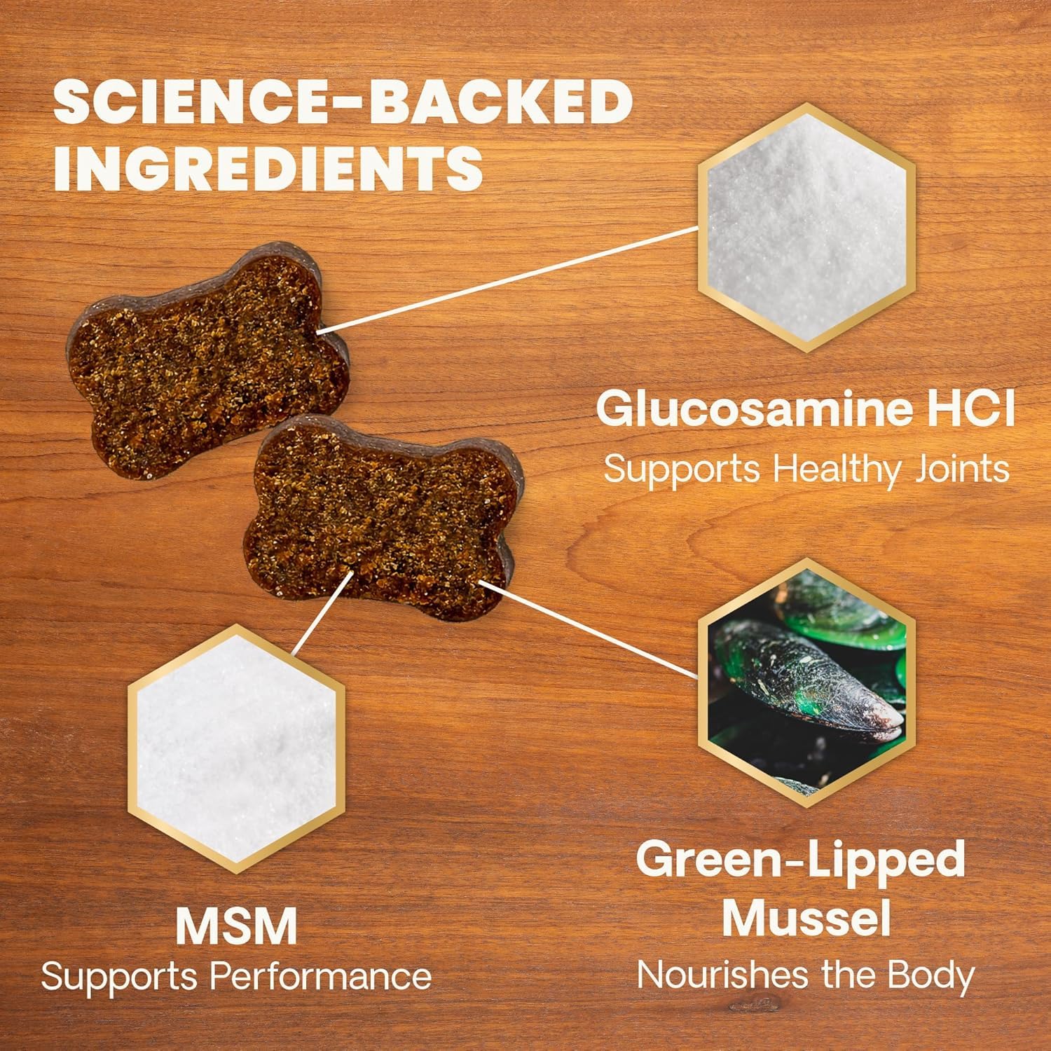 - Comprehensive 10-Ingredient Formula for Complete Joint Care – Each two-chew serving delivers 1000 mg glucosamine, 1000 mg MSM, 600 mg GlycOmega Perna canaliculus (green-lipped mussel), 100 mg DMG, plus antioxidants including vitamins C & E, grape seed extract, selenium, L-glutathione, and essential minerals like manganese to support cartilage, connective tissue, collagen formation, and oxidative balance.