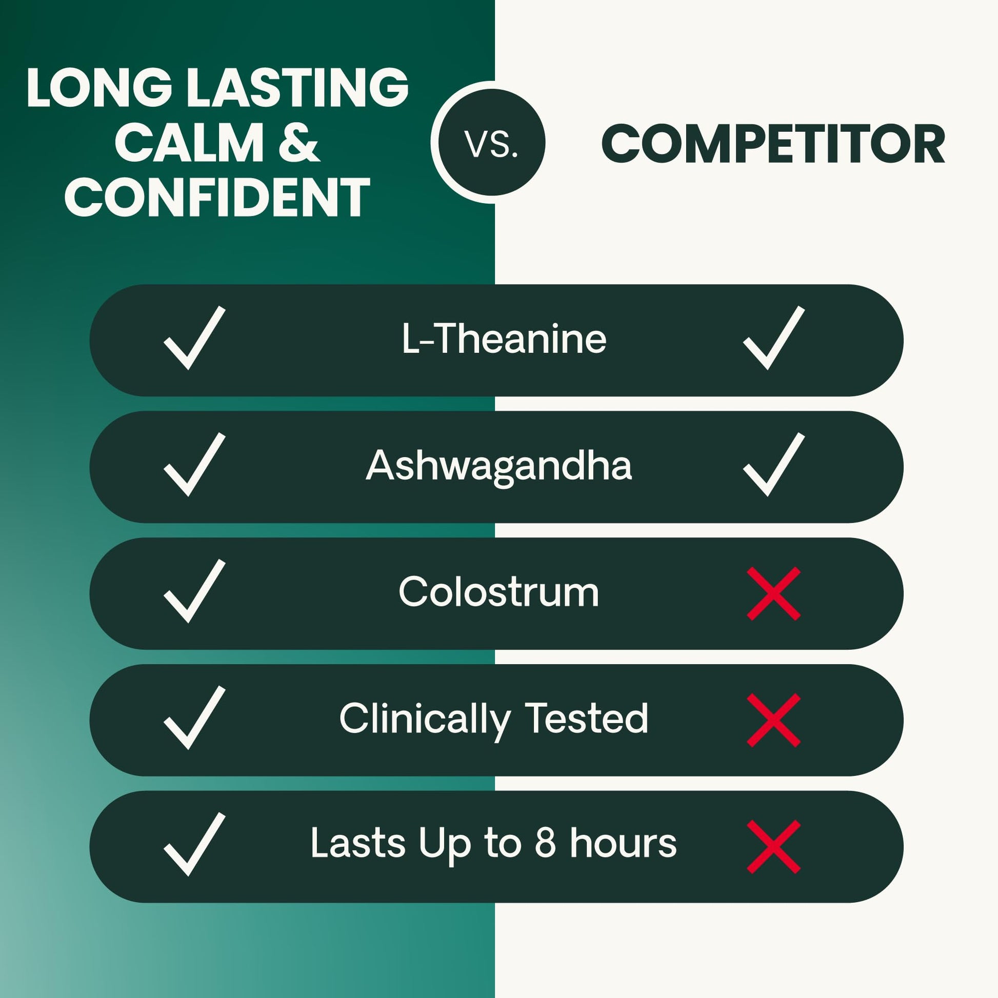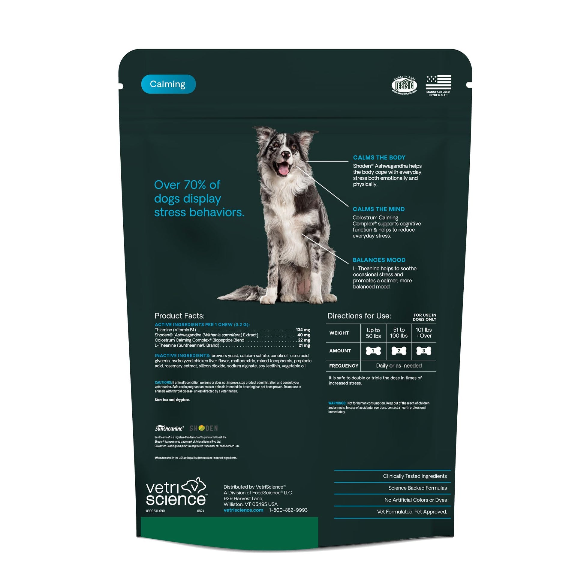 Details: Help remove the stress from your dog's life and transform their anxious behavior with VetriScience Long Lasting Calm & Confident (new name, same great original Composure Long Lasting formula). The VetriScience Long Lasting Calm & Confident formula has been clinically tested and shown to work quickly and last for up to 8 hours. These delicious bite-sized chews are made in the USA and designed to help calm and soothe anxious and stressed-out dogs with naturally sourced ingredients. Calming chews with ashwagandha help to reduce anxiety, improve sleep quality, and help manage separation anxiety as part of an approved training plan. The colostrum blend in Calm & Confident not only helps to reduce stress, but it supports your dog's cognitive function. Give the recommended number of chews to your dog when traveling, before their next vet visit, during the next thunderstorm, or whenever they're in a stressful situation - you can even double the dose if needed during periods of added stress. If your dog is showing signs of anxiety like separation anxiety, excessive barking, destruction of household items, or hiding, grab a bag today and see the results for yourself. Once dogs get a taste of the delicious flavor and chewy texture, they'll be begging for more! Our dog and cat supplements are certified by the National Animal Supplement Council (NASC), routinely undergo third-party testing, and contain no hidden ingredients, artificial flavors, synthetic colors or preservatives. Are you looking for the Golden Years Calm & Confident formula? Check out VetriScience Senior Calm & Confident.