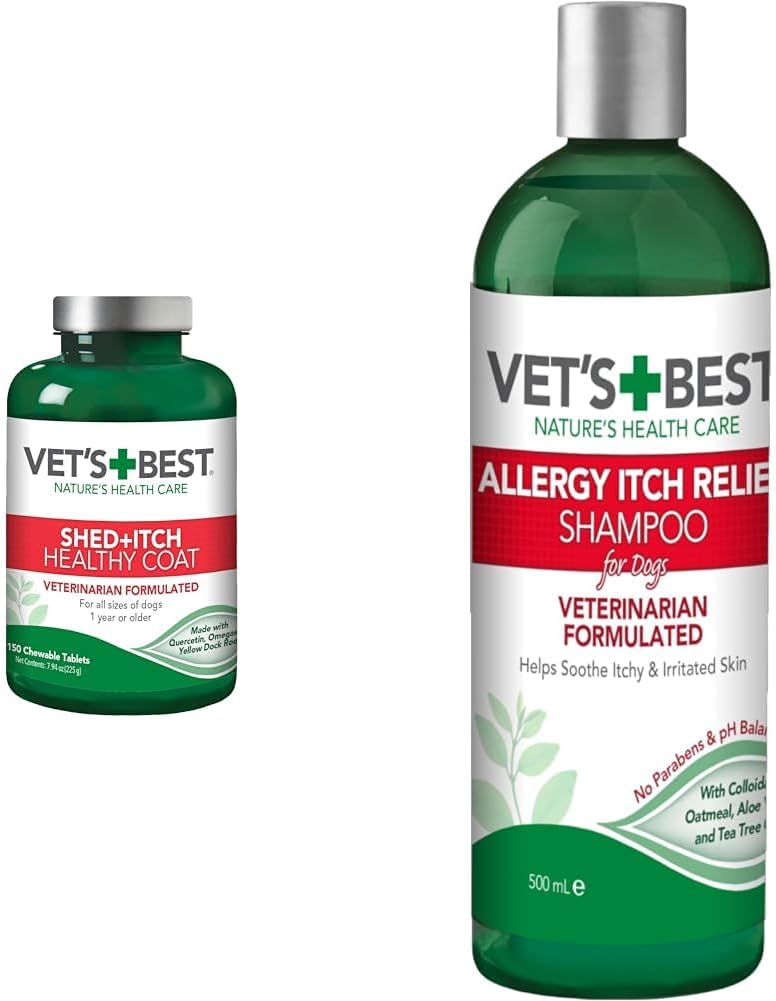 Vet's Best Healthy Coat Shed & Itch Relief Dog Supplements | Relieve Dogs Skin Irritation and Shedding Due to Seasonal Allergies or Dermatitis | 150 Chewable Tablets, White, 150 Count (Pack of 1) Help your dog maintain a healthy coat and put an end to dry, itchy skin with Vet's Best Healthy Coat Shed & Itch Relief Dog Supplements. Veterinarian-formulated balance of key natural ingredients boosts skin moisture and provides itch relief. Dogs like the taste, and the National Animal Supplement Council (NASC) gives it their Seal of Approval. Relief is here for itchy dogs, and their concerned pet parents.