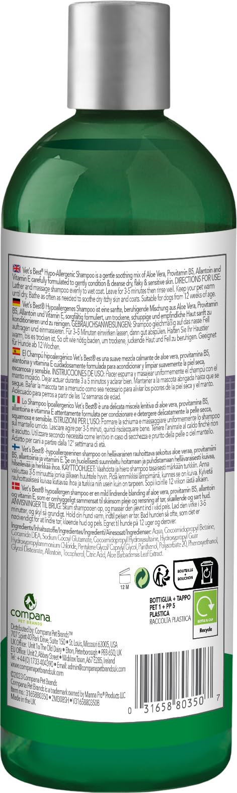 Details: Vet's Best Hypo-Allergenic Dog Shampoo (16 oz) cleans and moisturizes sensitive skin, relieves itching, and helps to smooth dry, brittle coats. This soothing mix of Aloe Vera, Allantoin and Vitamin E was carefully formulated to quickly condition dry, flaky, sensitive skin. For over 30 years, Vet’s Best has blended premium quality and plant-based ingredients that work together to comfort and protect your pet.
