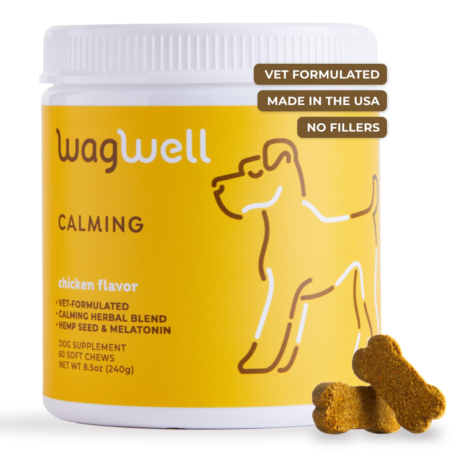 • ANXIETY SOOTHING SOLUTION: WagWell Calming Chews, are a natural and effective way to ease anxiety in your dog. Crafted with a blend of chamomile, passionflower, magnolia-bark extract, and other herbal ingredients, these anti-anxiety chews provide a comforting aid during stressful situations