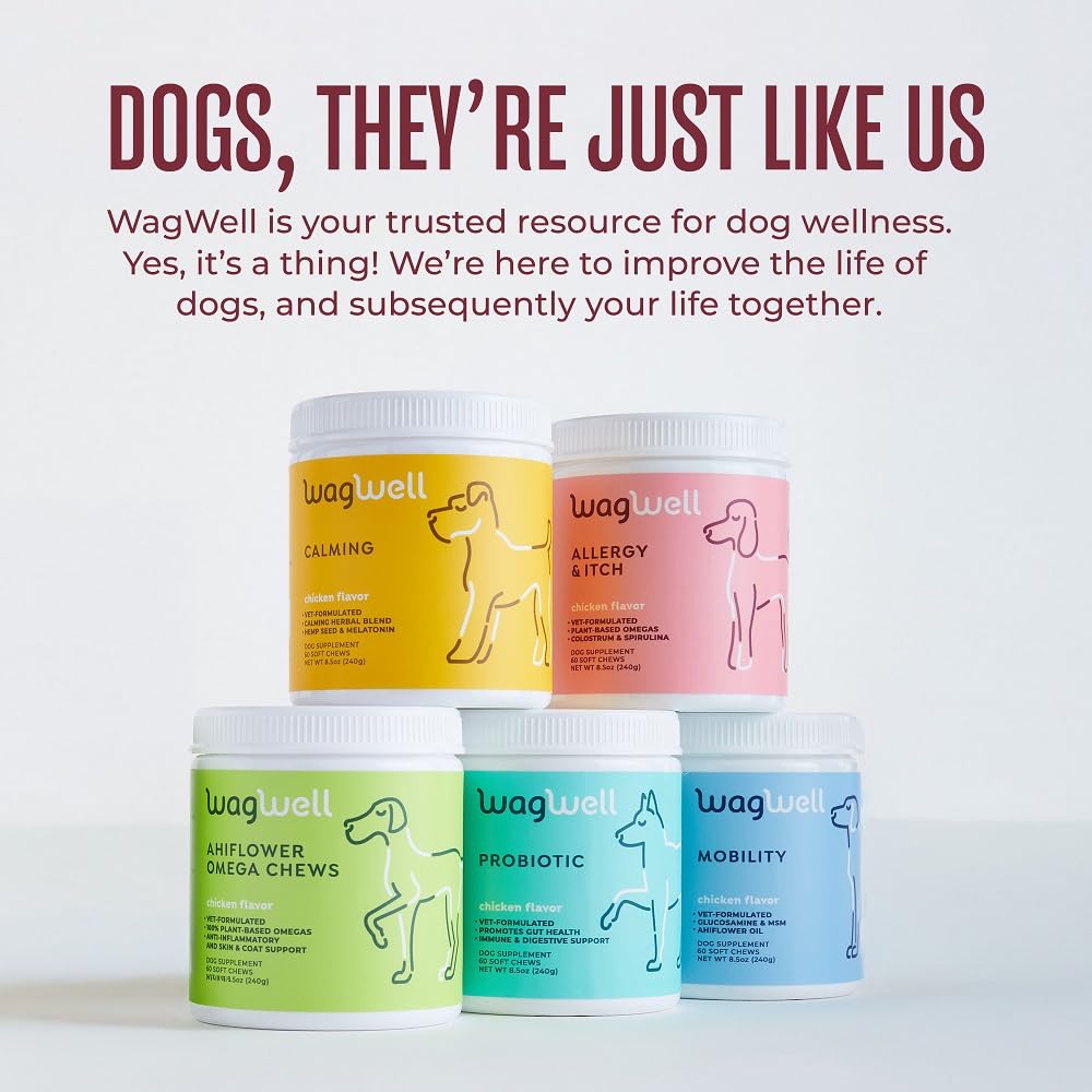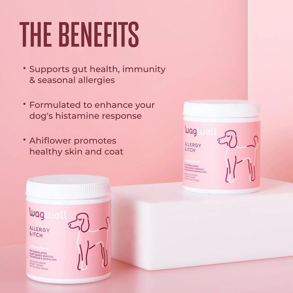 WagWell Allergy and Itch Chews – Chicken Flavored – Plant Based with Colostrum and Spirulina – Dog Skin and Coat Supplement for Itch Relief and Digestive Health, 60 Chews