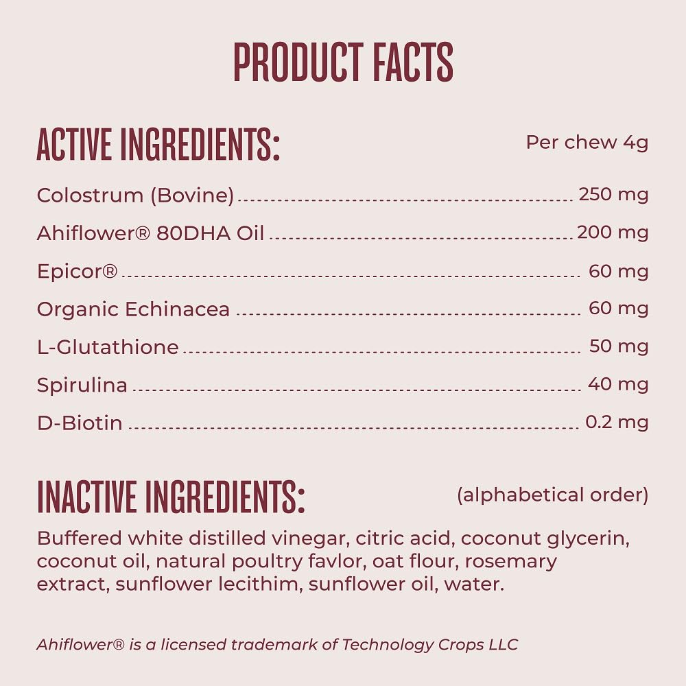 - YEAR-ROUND AND SEASONAL DOG ALLERGY RELIEF: An 8.5-oz. jar contains 60 soft allergy chews for dogs itching and licking irritated skin; these chicken-flavored allergy relief dog chew treats contain Colostrum, Epicor, Organic Echinacea, L-Glutathione, Spirulina and D-Biotin, and are suitable for dogs of all ages and sizes.
