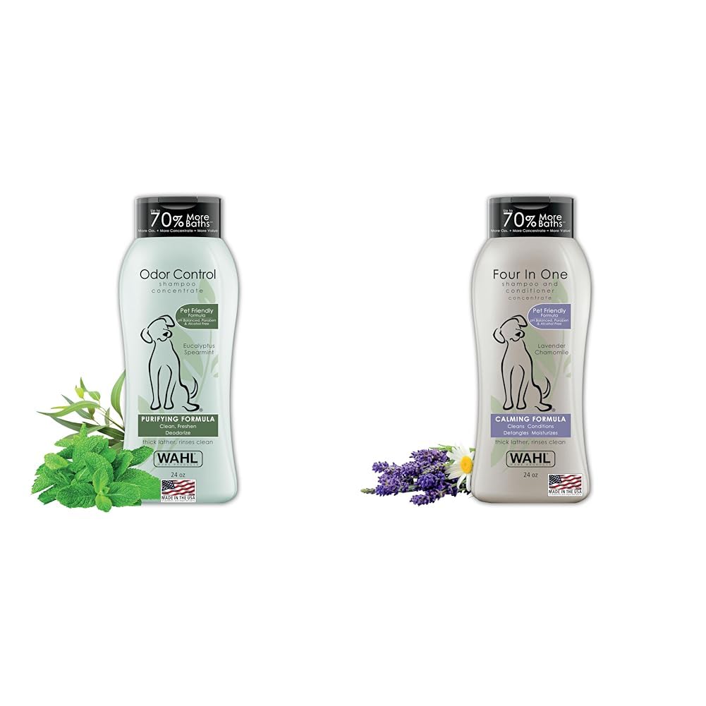 Details: This bundle includes two 24 oz bottles of concentrated, USA-made Wahl pet shampoos specially formulated to clean, condition, and freshen your dog's coat and skin. The Odor Control shampoo contains eucalyptus and spearmint to gently cleanse away dirt and residue while deodorizing with a refreshing scent. Its rich lather rinses clean to leave fur looking silky smooth. The Calming shampoo includes lavender and chamomile to soothe and moisturize as it cleans. It detangles and conditions fur for a soft, manageable coat. Both pH-balanced formulas avoid harsh chemicals and are alcohol, PEG-80, and paraben free. Their concentrated formulas allow up to 70% more baths than other brands. With one shampoo to deeply clean and deodorize and another to condition, detangle, and calm, this bundle offers a complementary pair of Wahl's professional-quality shampoos to keep your dog's coat fresh, healthy, and smelling great.
