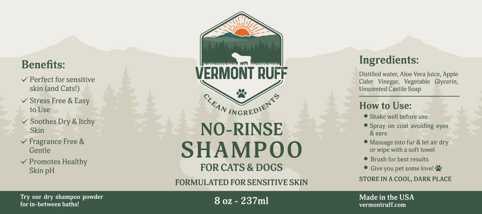 Details: Vermont Ruff Waterless Shampoo is specially formulated for cats and dogs with ultra-sensitive, allergy-prone, or easily irritated skin. Waterless and no Rinse Formula – Easily clean your pet quickly without using water. This waterless shampoo leaves your dog and puppies fresh smelling with a shiny coat without washing them. Perfect for dogs who dislike bathing or going to the groomer. We use only the mildest, natural ingredients to help soothe and hydrate dry or itchy skin. Perfect for pets with allergies, senior pets, or those who dislike water, this gentle spray is designed to clean without disrupting the skin’s natural balance. Just spray, massage, and towel dry—no rinsing needed! Skin and Coat – Cleanse, hydrate, nourish the skin and coat which can help decrease shedding, itch and allergies. Eco-friendly - Safe for dogs and cats. Free of dyes, synthetic fragrances, parabens, phthalates Made in the USA with globally sourced ingredients. How to Use: 1. Shake well before each use. 2. Lightly mist onto your pet’s coat, avoiding eyes and ears. 3. Gently massage into fur and let air dry or wipe with a soft towel. 4. Brush for best results. 5. Give your pet some love!