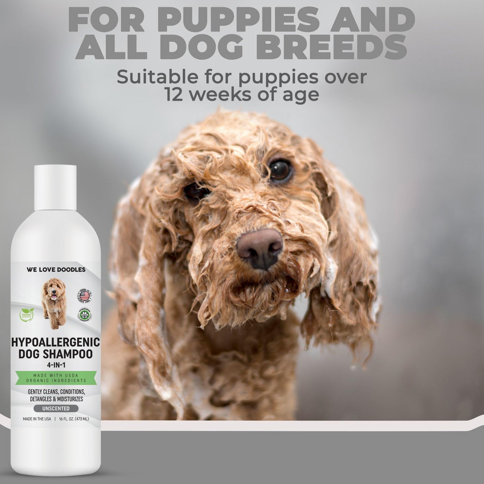 HYPOALLERGENIC 4-in-1 DOG SHAMPOO: Effectively cleans, conditions, detangles, and moisturizes your dog’s skin. Keep your dog’s fur soft, clean, and less tangled with one easy solution.
