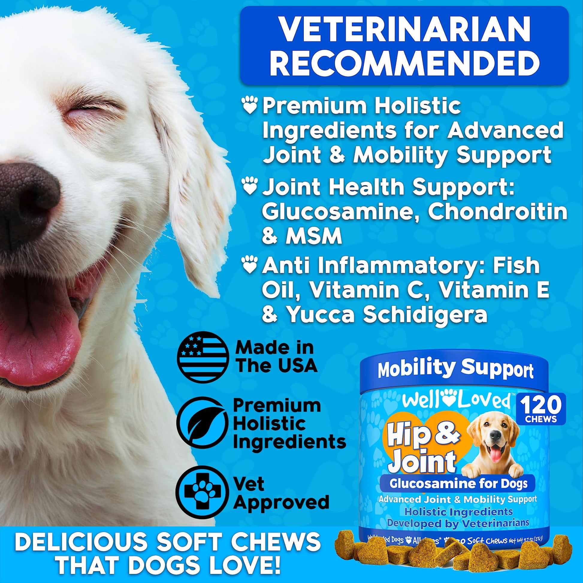- Glucosamine for Dogs: Well Loved Dog Hip and Joint Chews are advanced, veterinarian-formulated soft chews with glucosamine, chondroitin, MSM, and more to support joint health and mobility. They help prevent hip and joint pain and stiffness caused by age, activity, or trauma.