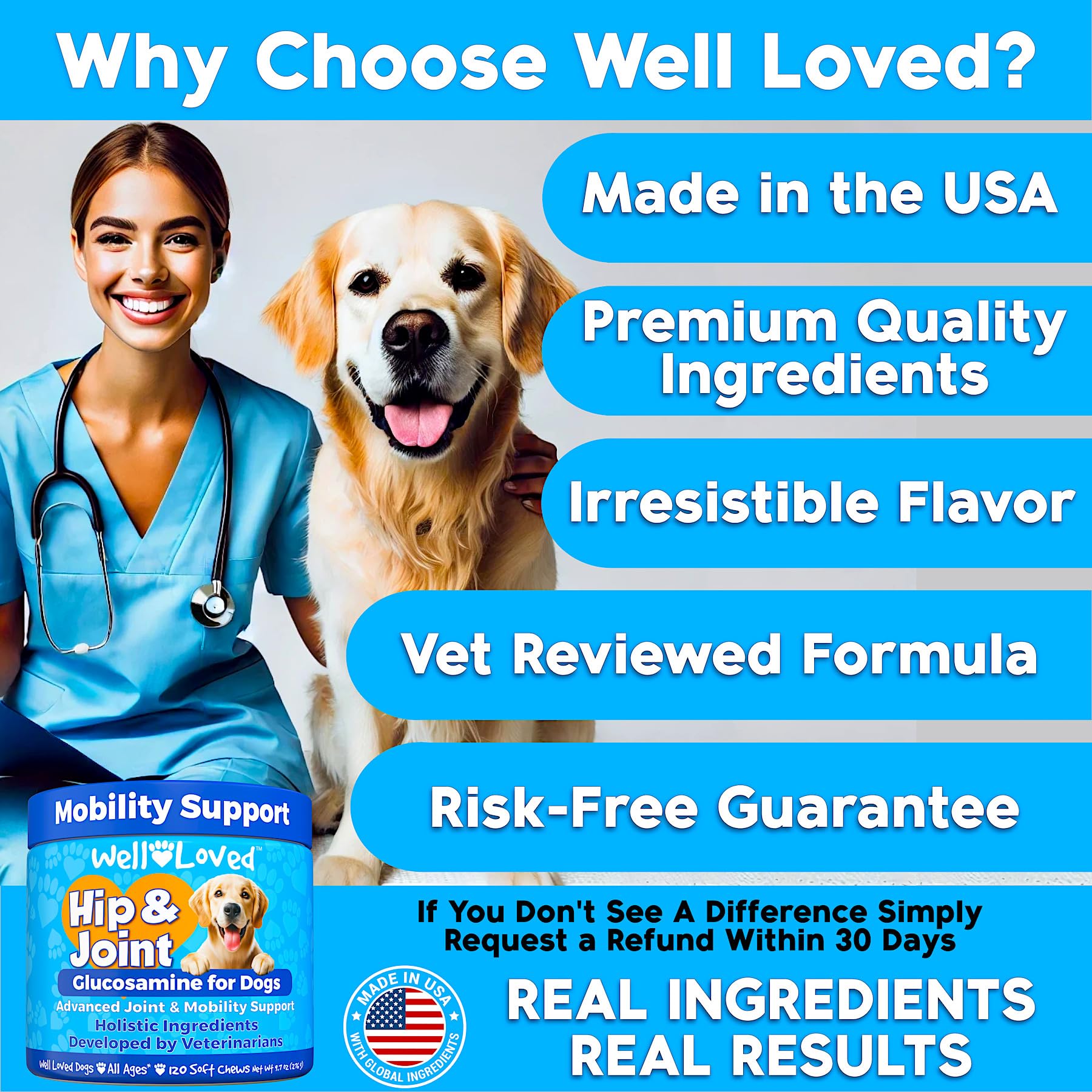 Well Loved Glucosamine for Dogs - Joint Supplement for Dogs, Made in USA, Vet Developed, Glucosamine Chondroitin, Hip and Joint Chews with MSM, Large Breed, Pain Relief, 120 Chews