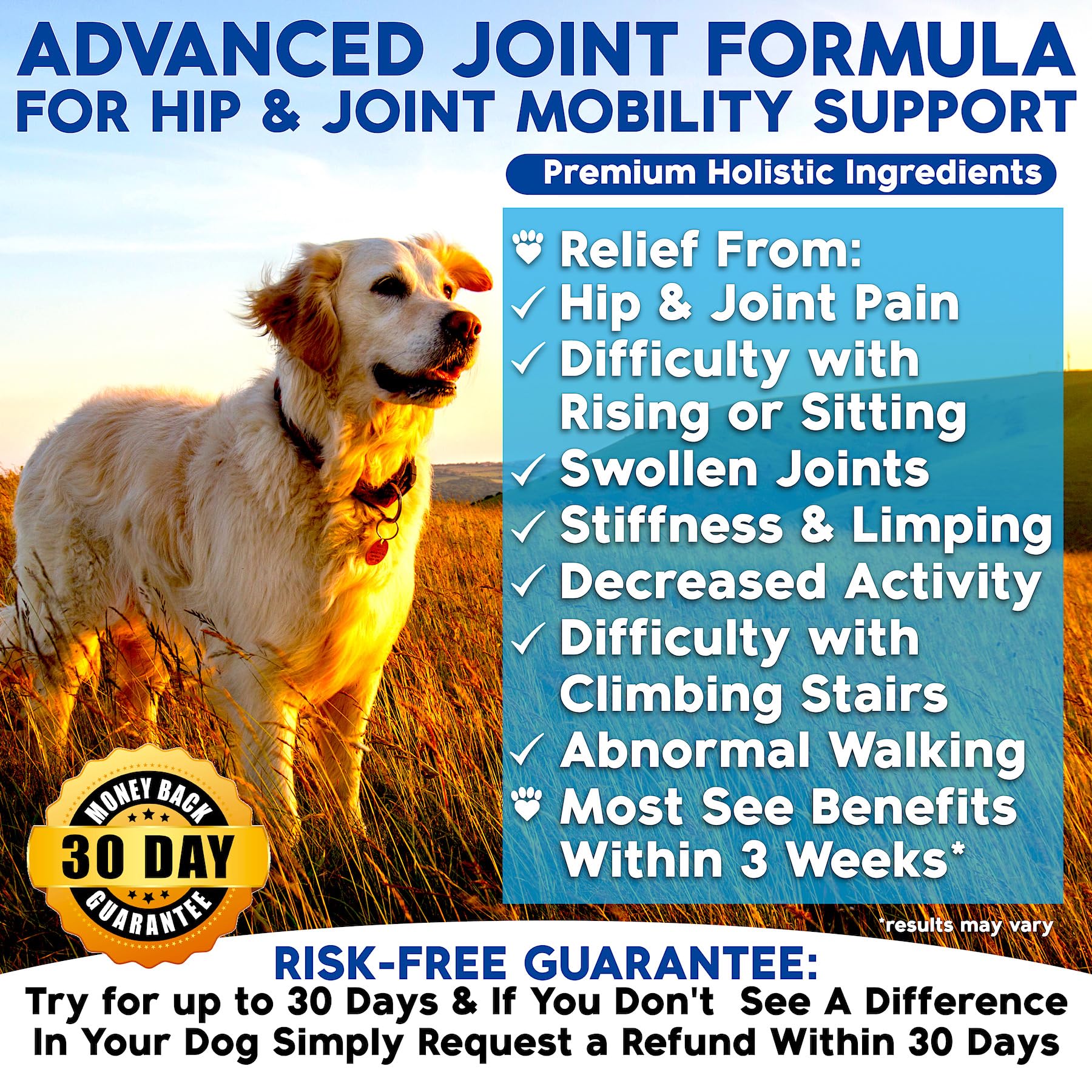 - Deliciously Healthy Chews: No more hassle with pills, tablets, or capsules. Our dog hip and joint supplement is a soft, tasty, chewable treat every dog loves. These chews provide complete and advanced care in every bite.