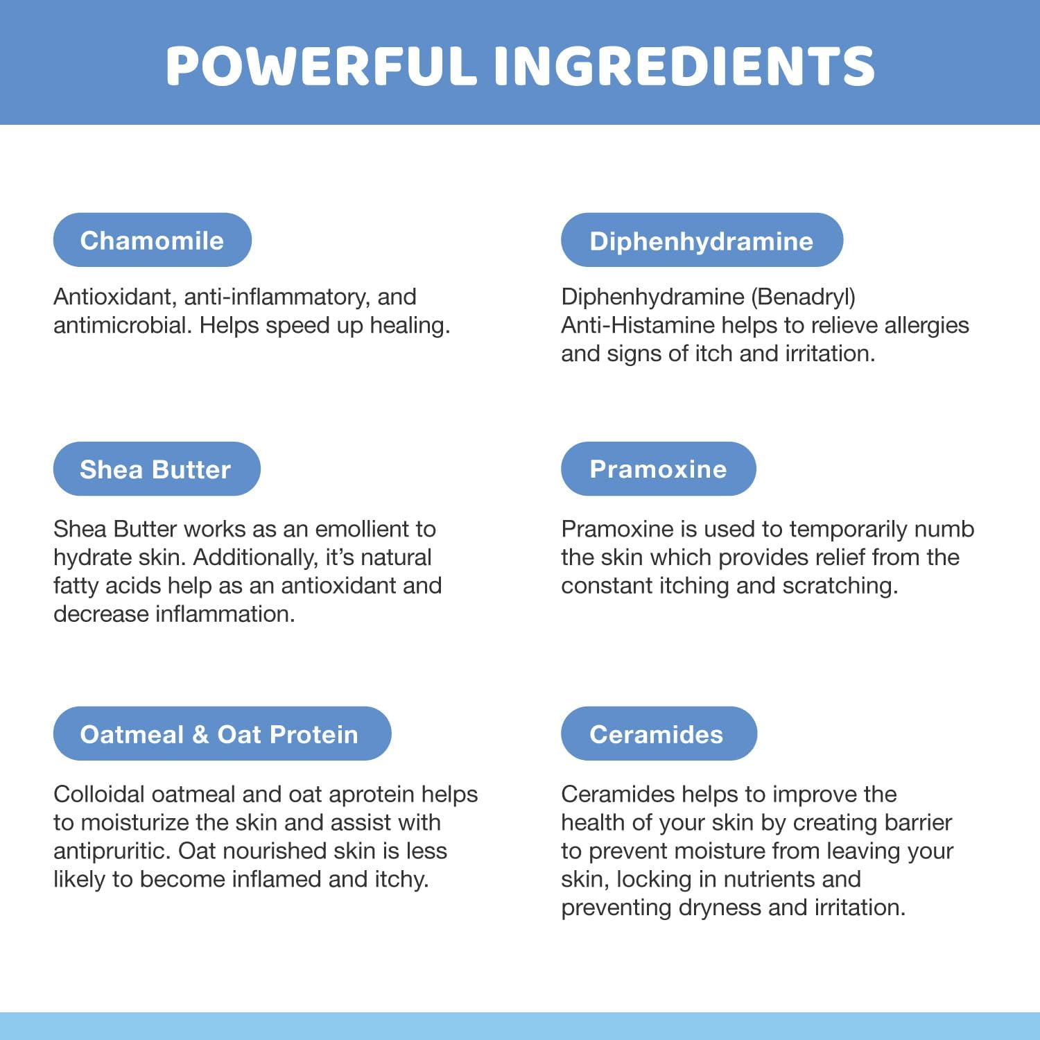 RELIEVES DRY, ITCHY SKIN, & ALLERGIES - Our blend of ultra soothing ingredients like Pramoxine, Diphenhydramine , Chamomile extract, Shea Butter, Ceramides, and Oatmeal to moisturize the skin and reduce itching, irritation, dandruff, flakiness, dryness, and redness caused by seasonal allergies.