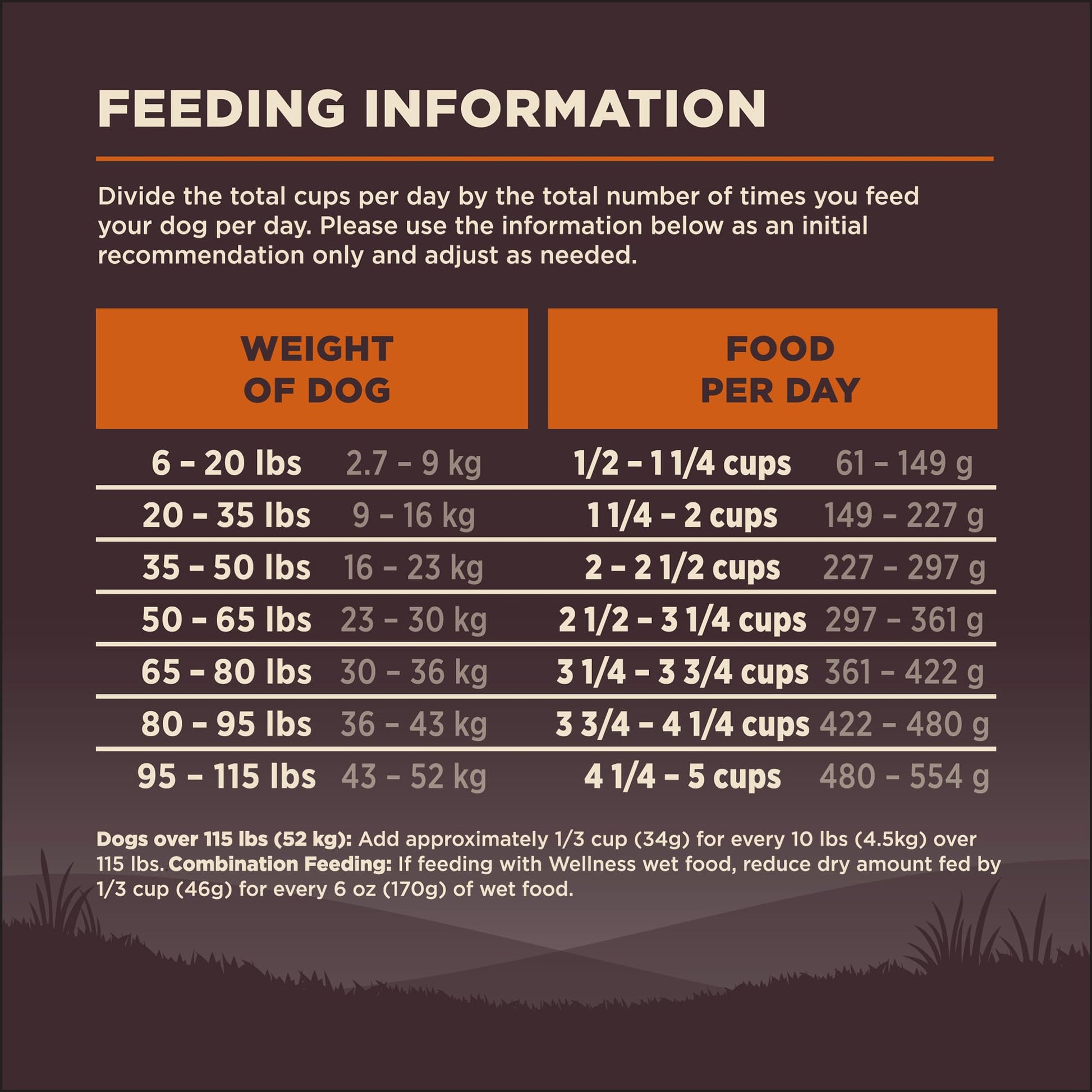 Details: Wellness CORE Natural Grain Free Dry Dog Food Original Turkey & Chicken Recipe is healthy, 100% natural grain free dog food for adult dogs made with turkey, chicken, salmon oil and fruits and vegetables to help support your dog's optimal health and fortified with antioxidents, probiotics, vitamins and minerals, including fish and flax omega blend for healthy skin and coat. Wellness CORE grain free dog food formulas are based on the nutritional philosophy that dogs thrive on a diet mainly comprised of meat. Each grain free, nutrient-rich formula provides high quality protein for your dog with no meat by-products or fillers, grain, corn, soy, wheat-gluten or artificial preservatives, colors or flavors.