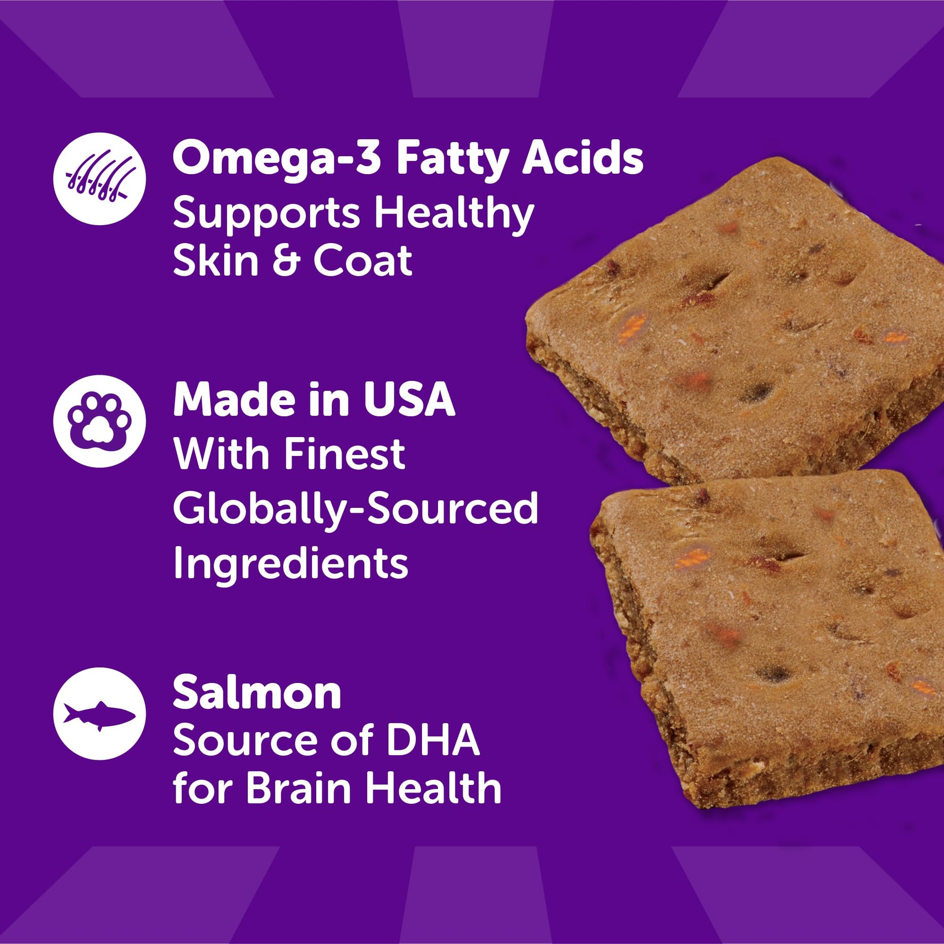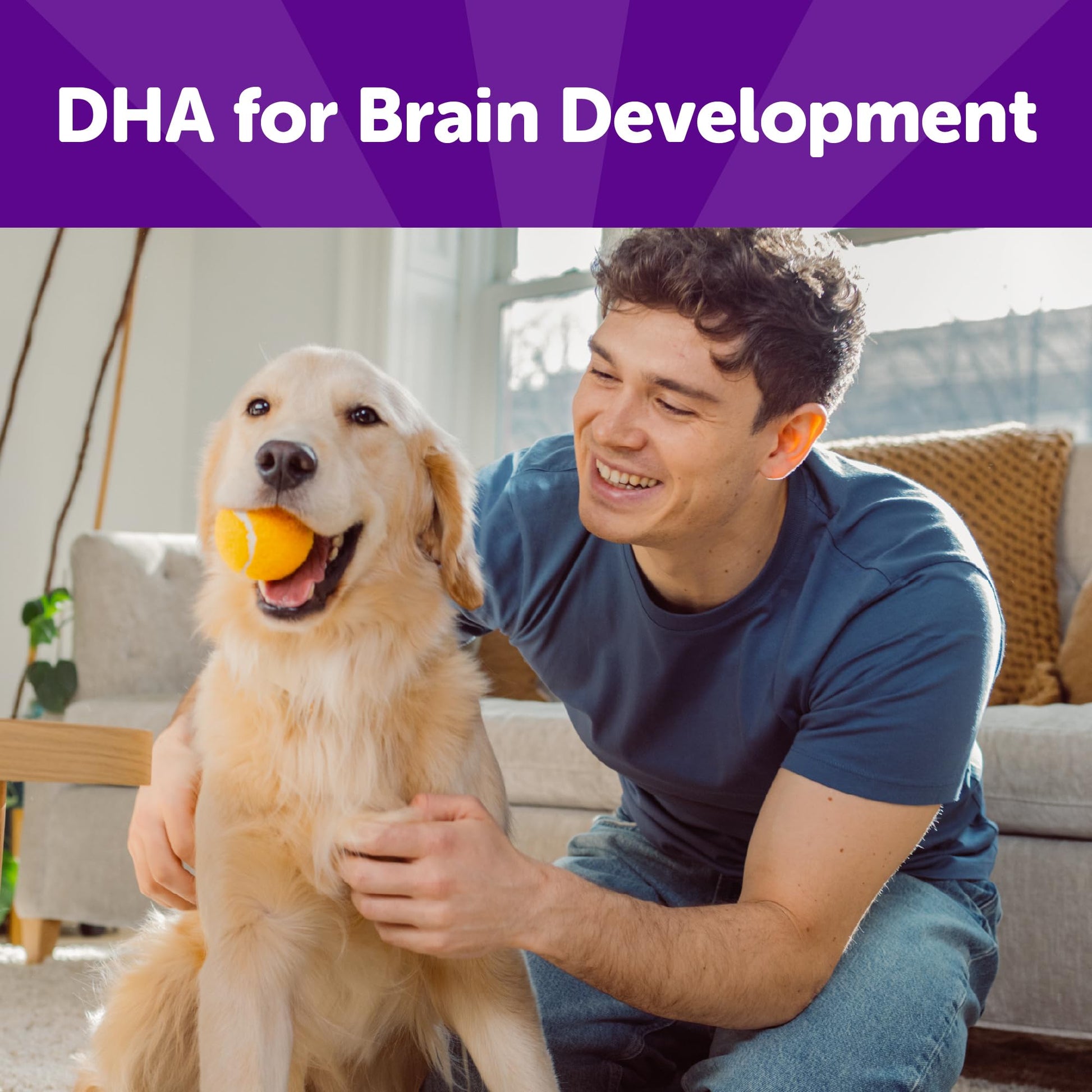 - SUPPORTS BRAIN DEVELOPMENT & SHINY COAT: Guaranteed levels of DHA from salmon oil support brain development and Omega-3 fatty acids from flaxseed promote a healthy, shiny coat for your dog.