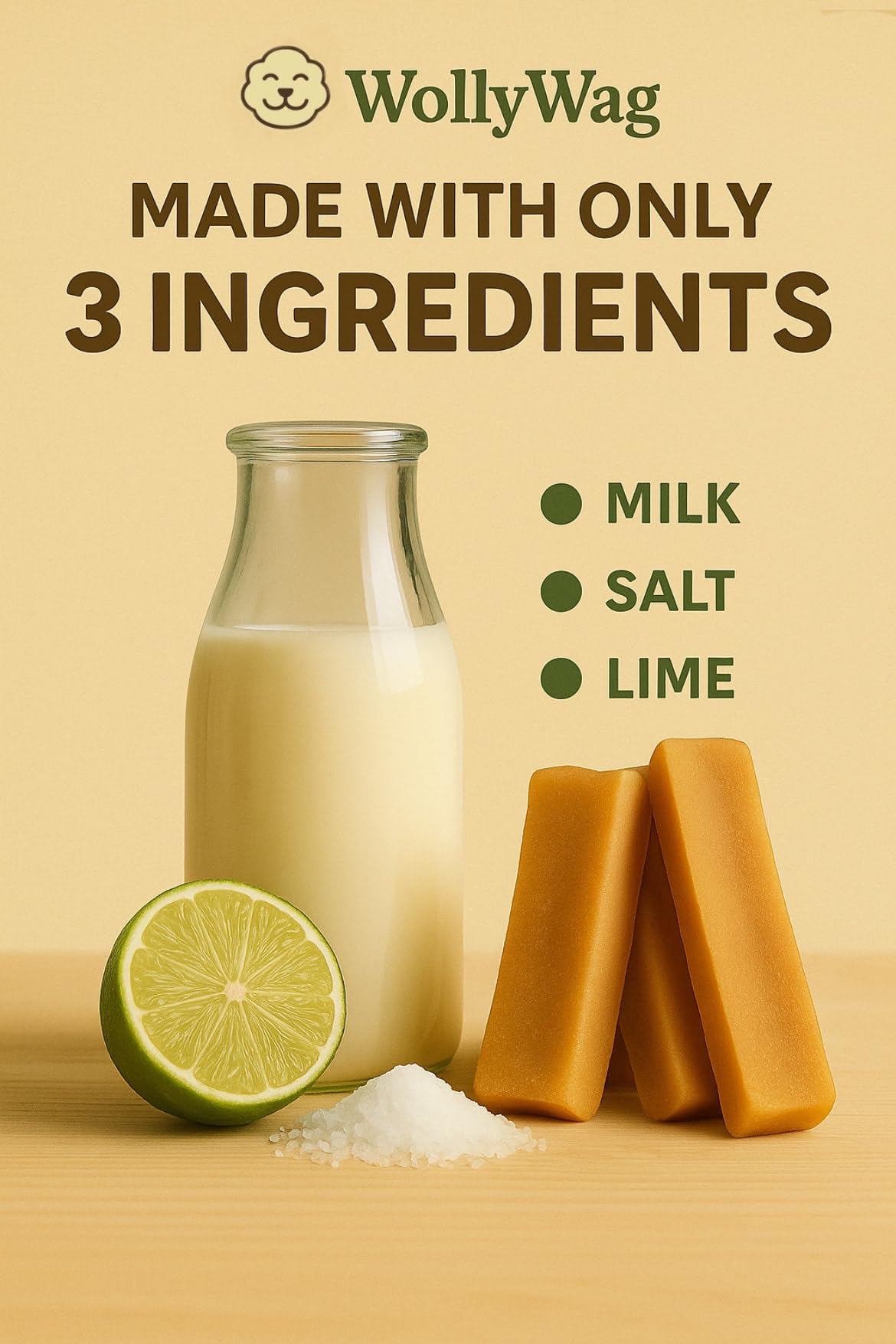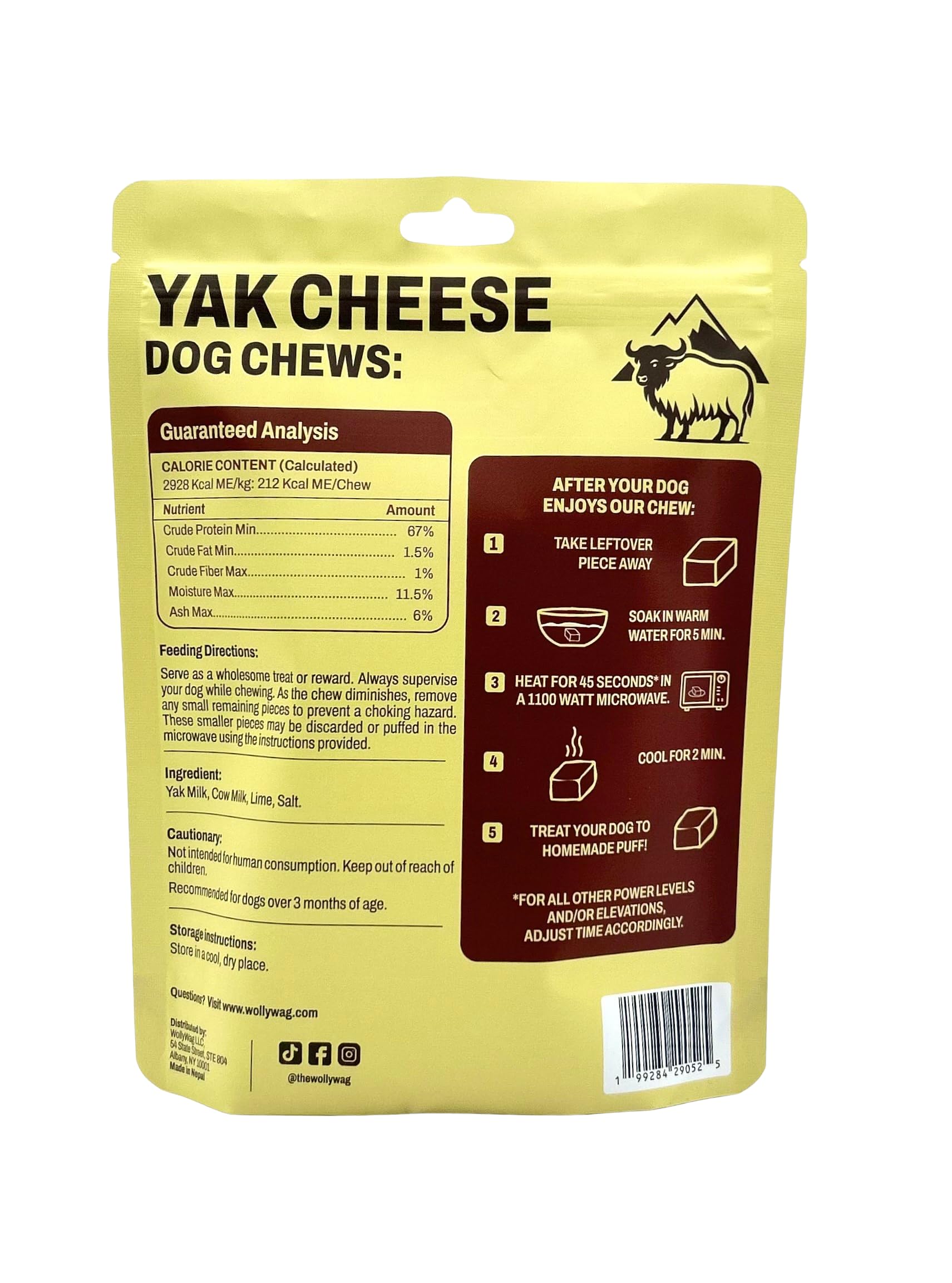 Details: WollyWag Yak Cheese Himalayan Dog Chews – Safe, Long-Lasting Chews for All Dogs. WollyWag brings you the ultimate in natural chewing: handcrafted yak cheese Himalayan dog chews made in Nepal using a traditional recipe passed down for centuries. These safe dog chews are made from just yak and cow milk, lime juice, and salt—with zero chemicals, preservatives, or fillers. WollyWag delivers natural yak chews for dogs that are more than just treats—they’re a time-tested tradition from the Himalayas. Not sure what to call them? Don’t worry—whether you’ve heard them called yak sticks, cheese bones, or yak milk bones for dogs, they’re all the same wholesome Himalayan dog chew. Made with just milk, salt, and lime juice, our Himalayan cheese sticks for dogs are packed with calcium, protein, and minerals. Long-lasting yak bones are strong enough for aggressive chewers—better than rawhide, which flakes apart easily, and naturally high in protein, calcium, and essential nutrients. Naturally lactose-free, gluten-free, and easy to digest, these chews are also mess-free and odor-free, making them ideal for indoor use. Chewing reduces tartar and plaque, supports healthy gums, fresher breath, and mental stimulation. Available in different sizes—5 Small Chews for small dogs (0–15 lb), 4 Medium Chews for medium dogs (15–30 lb), and 4 Large Chews for large dogs (30–75 lb)—WollyWag fits dogs of all sizes, from Himalayan yak chews for big breeds to softer options for pups. As a bonus tip, small leftover pieces can be microwaved into a crunchy cheese puff! Instructions are provided on the back of the package—please follow them carefully.