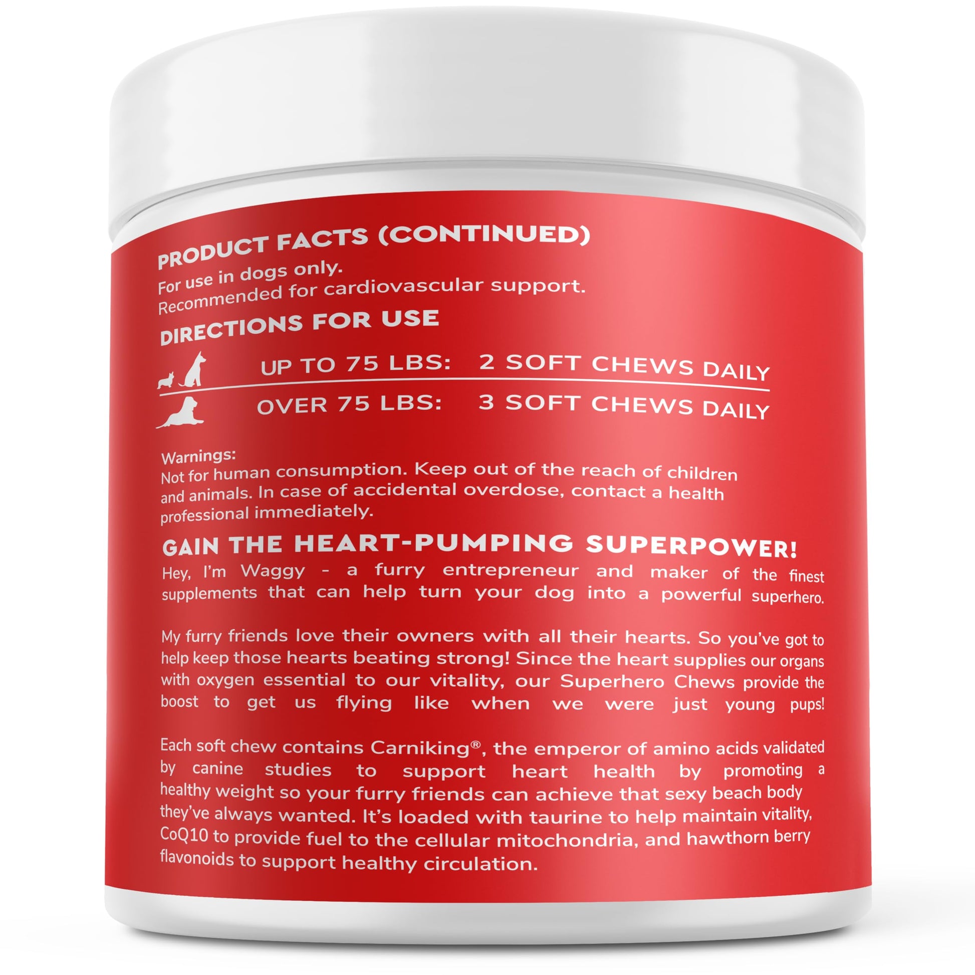 - CLINICALLY STUDIED L-CARNITINE: Wonder Paws Cardiovascular chews for dogs includes Carniking, a powerful clinically studied L-Carnitine to help support heart health, energy and weight management. We’ve also included a powerful dose of Taurine for dogs, Hawthorn Berry and CoQ10 for dogs’ hearts and cardiovascular support. Unlike other cardio canine formulas, we use ingredients that have shown to work in pets.