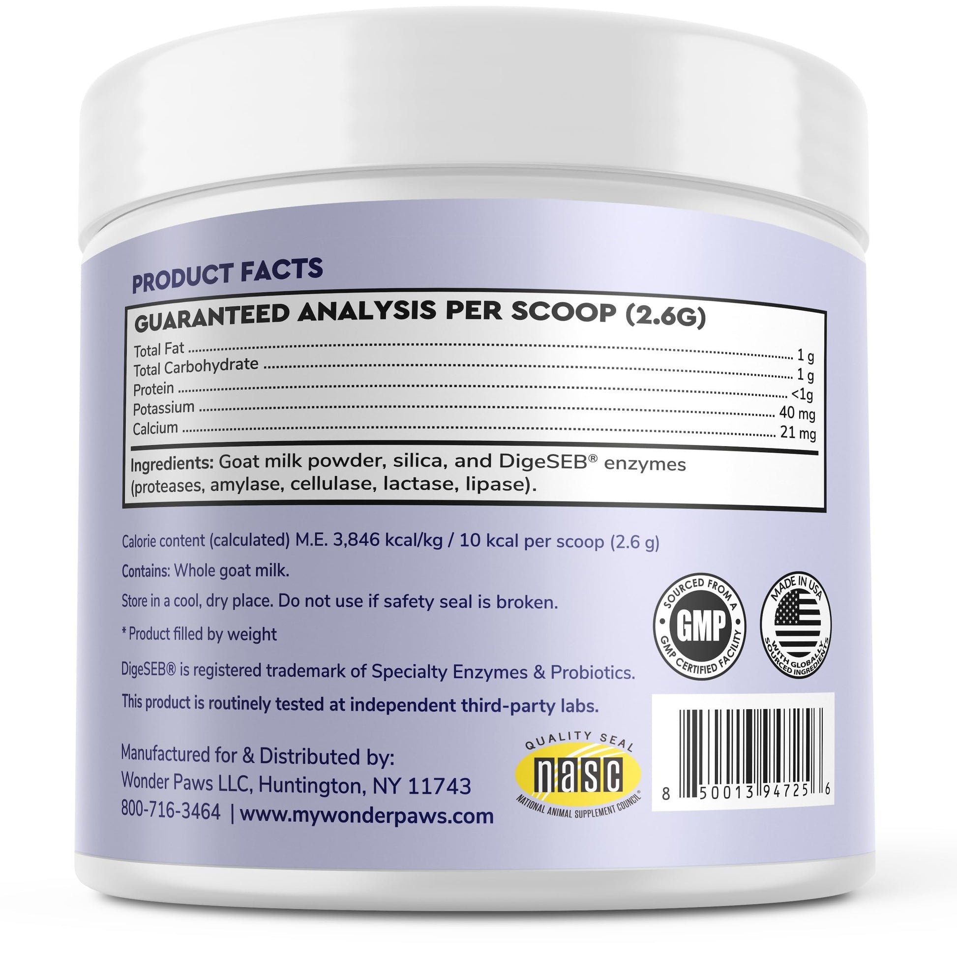 - POWERFUL GOAT MILK FOR DOGS: Wonder Paws powdered goat milk for dogs uses the highest quality goat milk with naturally occurring probiotics and added enzymes to help support healthy digestion, immunity and allergies. Whether your pet is a puppy or an adult, our whole powdered goat milk for dogs helps provide the same benefits as raw goat milk but in an easy to use food topper. Just add water to our goat milk supplement for dogs to create a nourishing drink or pour over your pet’s food as a delicious topper!