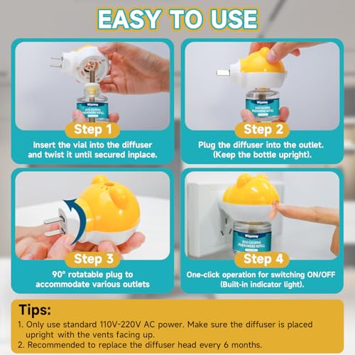 • Lasts Calm for 120 Days: The value-packed 6-in-1 calming liquid set includes 4 x 48ml refill bottles and 2 diffusers. Each refill bottle of dog pheromones provides up to 30 days of continuous calming effects. This dog diffuser calming kit offers long-term dog anxiety relief for up to 120 days. Operating the calming dog diffuser is simple and hassle-free.