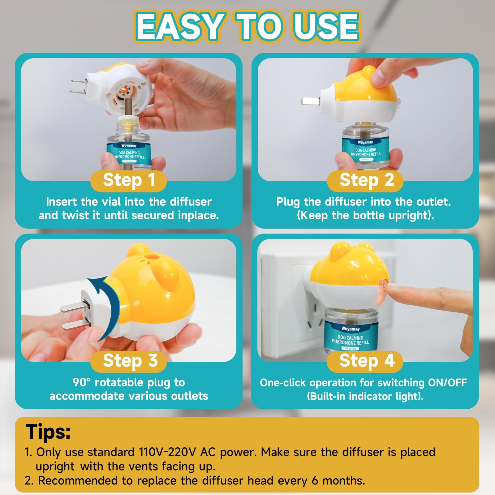 • Multifunctional Anxiety Relief: The Woyamay dog calming diffuser can help dogs effectively alleviate anxiety and stress, reducing common stress signs such as scratching, urine spraying, conflicts between dogs, barking, fear, and reactions to new environments. It provides dogs with comfortable sleep and a joyful daily life.