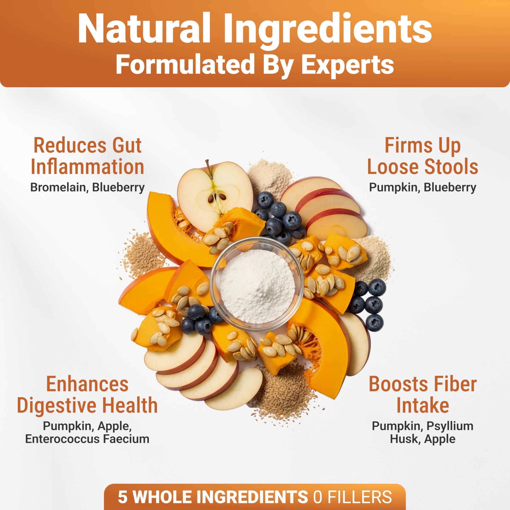 - KEEPS DIGESTION ON TRACK – Give your pup the boost they need with natural fiber for dogs. This pumpkin blend supports regular bowel movements, aids nutrient absorption, and keeps their tummy happy without fillers or artificial ingredients.