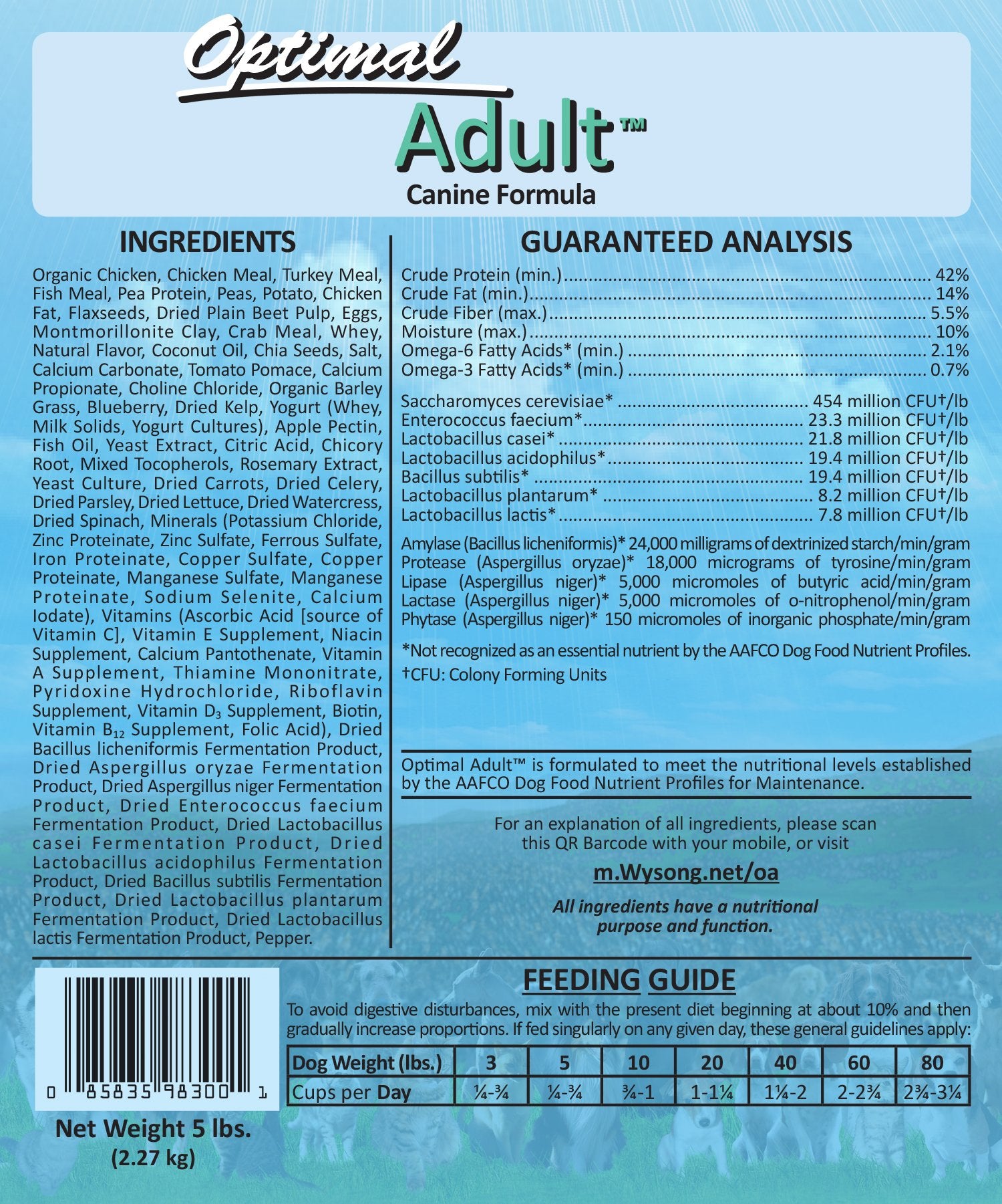 Details: For the past 35 years the Wysong goal and commitment has been to reconcile modern food forms and processing with the natural canine/feline diet. Wysong Optimal Diets represent new advanced technology that moves companion animal nutrition closer than ever to archetypal genetic expectation. Optimal Adult super premium dog food contains very low levels of carbohydrate, low glycemic index, multiple organic ingredients, unsurpassed levels of enzymes and probiotics, natural omega-3: omega-6 fatty acid ratios, a superb spectrum of micronutrients, including life stage specific nutraceuticals, and more.