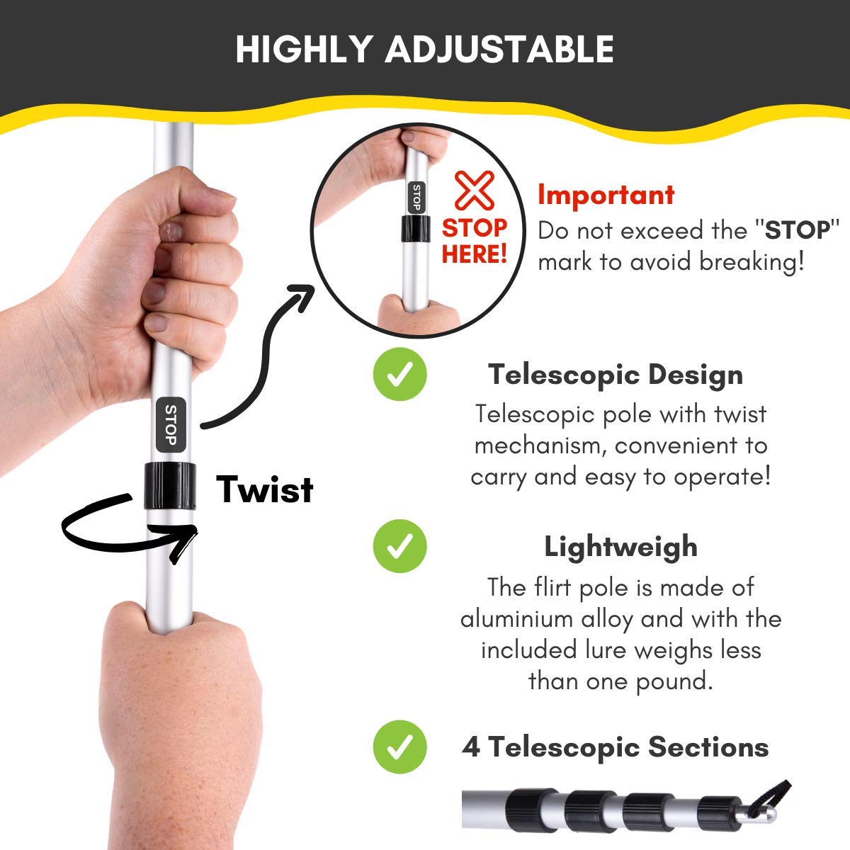 DURABLE yet LIGHTWEIGHT - This flirt pole is flexible, the durable shaft will never snap or splinter like other fiberglass stick toys and DIY versions, yet the flirt pole with lure weighs less than one pound! Telescopic design, lightweight, convenient to carry, and easy to operate! Length of pole: min 18.5", max 45"; length of cord: 46".