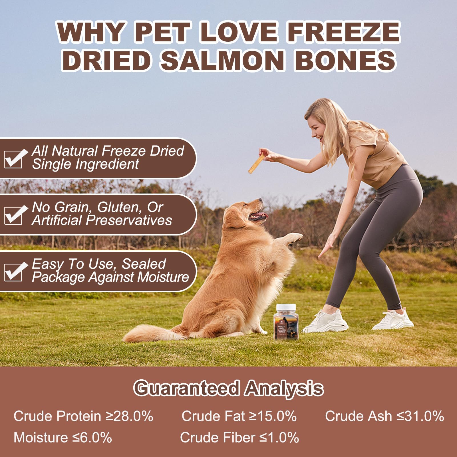 - ALL NATURAL SINGLE INGREDIENT DOG CHEW BONES : Selected high-quality salmon bones, freeze-drying process to lock in nutrition, do not contain artificial additives, preservatives or pigments, 100% pure natural raw materials, so pets can eat with confidence