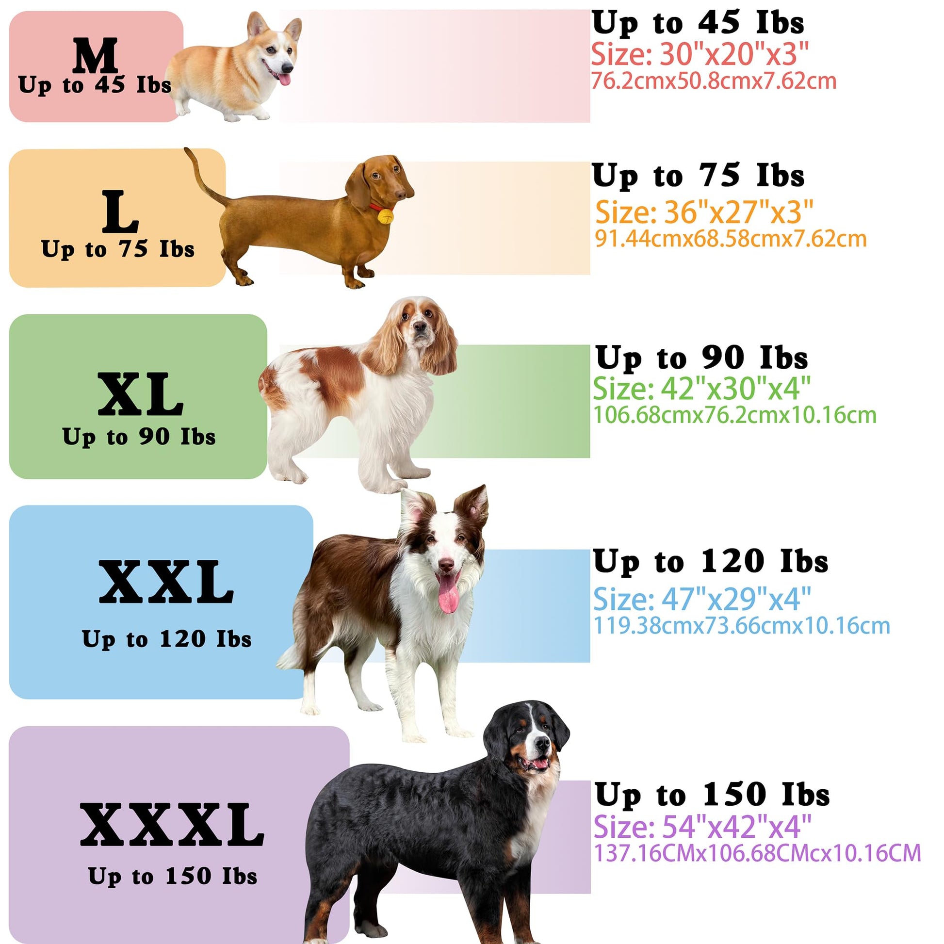 • MORE DETAILS OF THE KENNEL PAD: There are 5 kinds of sizes for you choose, 30x20x3 Inch M, 36x27x3 Inch L, 42x30x4 Inch XL, 47x29x4 Inch XXL, 54x42x4 Inch XXXL for your dog such as Labrador Retriever, Standard Poodle, German Shepherd, French Bulldog, Retrievers (Golden) , Bulldogs, Rottweilers and so on. As the foam is compressed in package box, please pulled it out, let it expand, place inside the cover and zips up, there will be a comfortable dog bed mat in front of you!