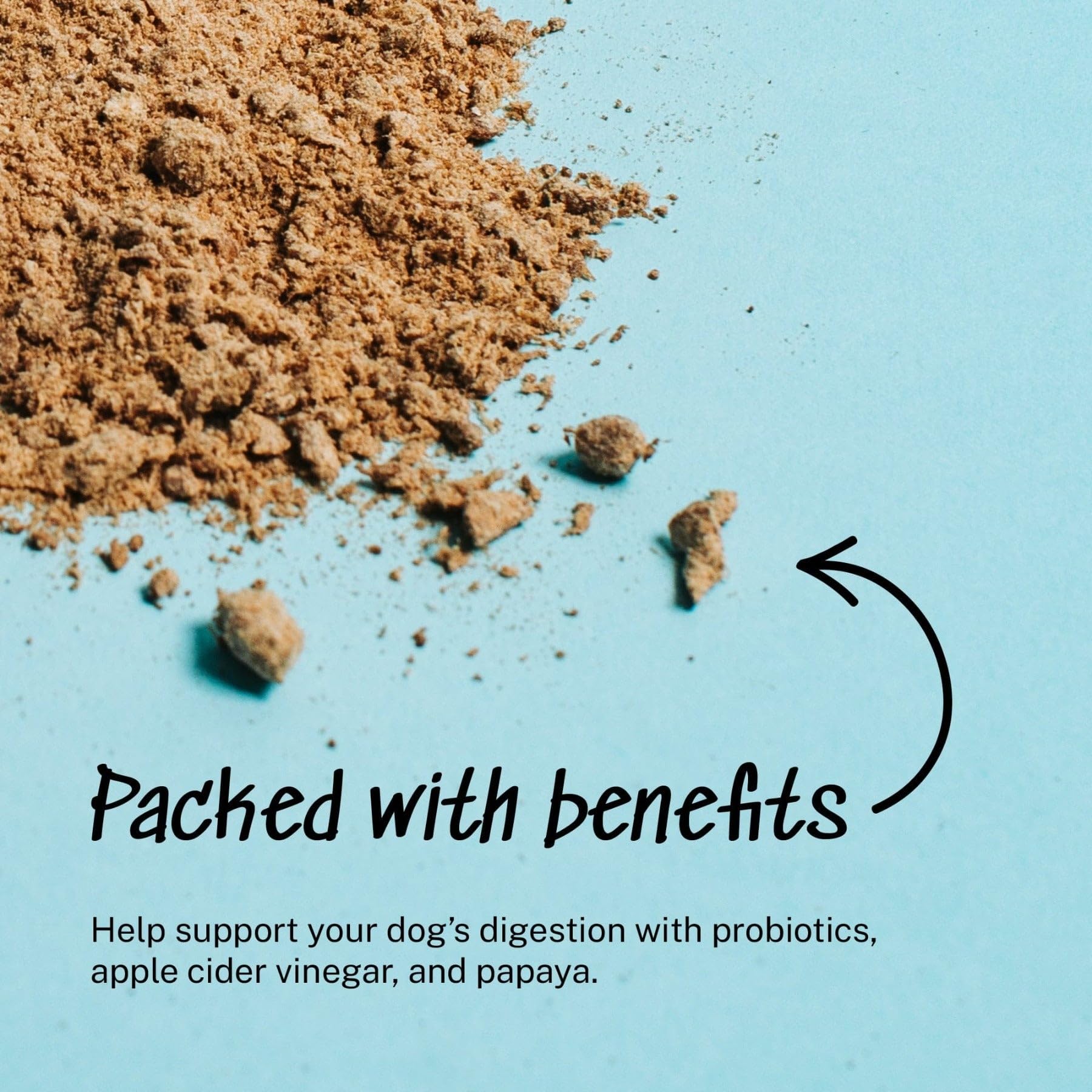 - PROBIOTICS & DIGESTIVE AID – Infused with apple cider vinegar and papaya, this dog food supplement supports healthy digestion, alleviates gastrointestinal discomfort, and helps with bloating and inflammation.