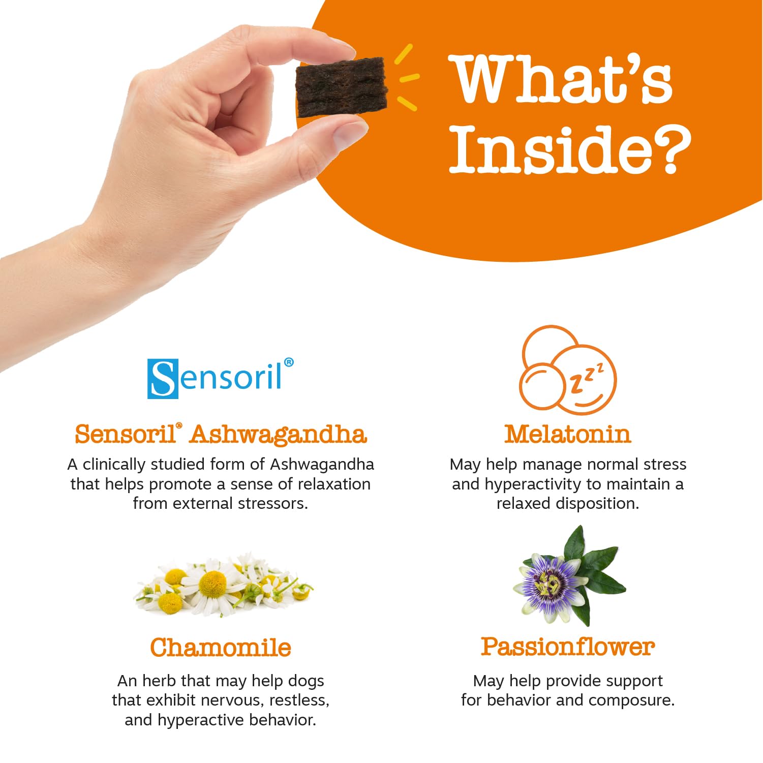 • Great for Stressful Situations – Whether it’s a thunderstorm, fireworks, car rides, travel, parks, or separation anxiety, these delicious pet treats promote relief from normal stressful moments.