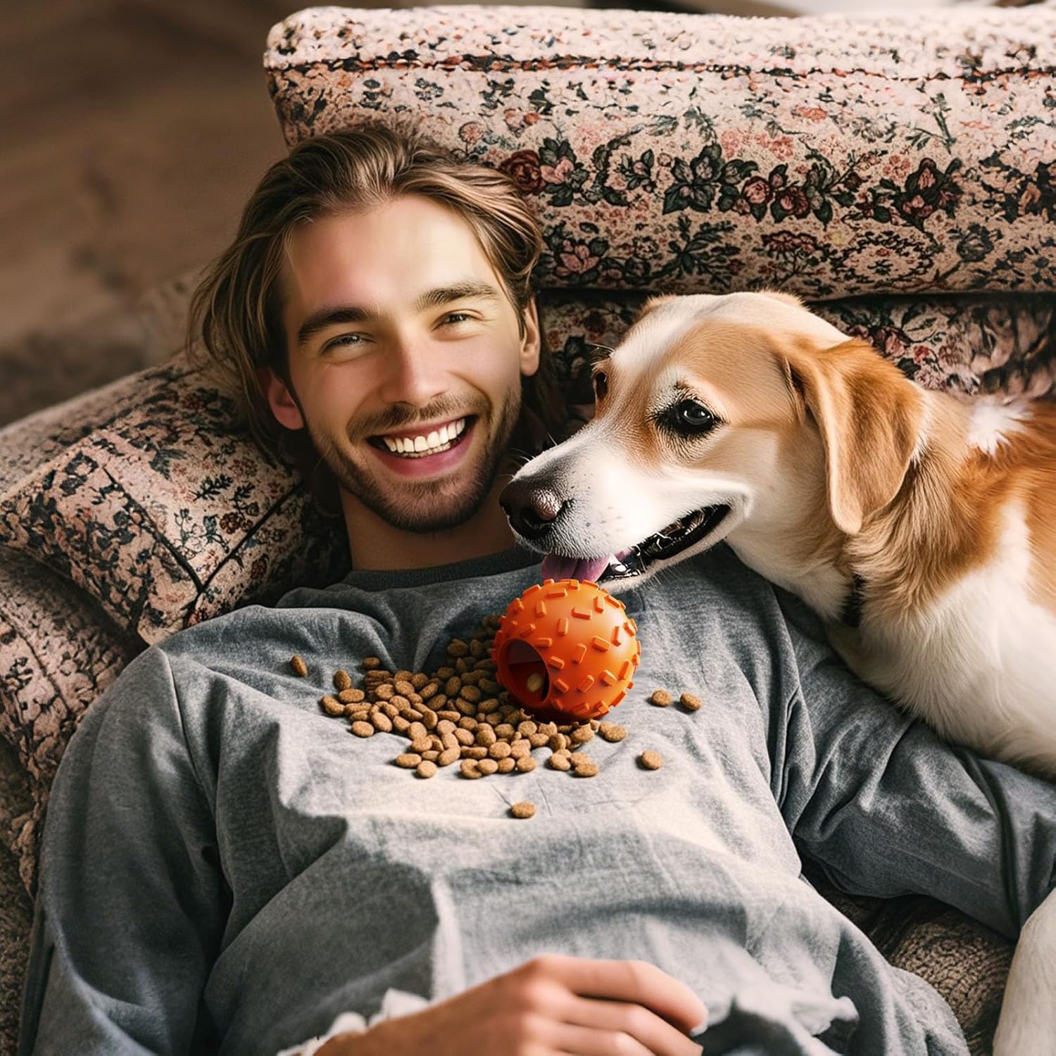 • This interactive dog ball is designed to prevent boredom while stimulating your dog’s mind. Made from eco-friendly natural rubber, it's safe, durable, and easy to clean. Simply add treats inside the ball to provide 20-40 minutes of fun, keeping your dog occupied and mentally engaged. It’s perfect for all dog sizes and works as a great tool for anxiety relief, reducing destructive behaviors caused by stress or loneliness—an ideal choice for dog toys to keep them busy and mental stimulation dog toys.